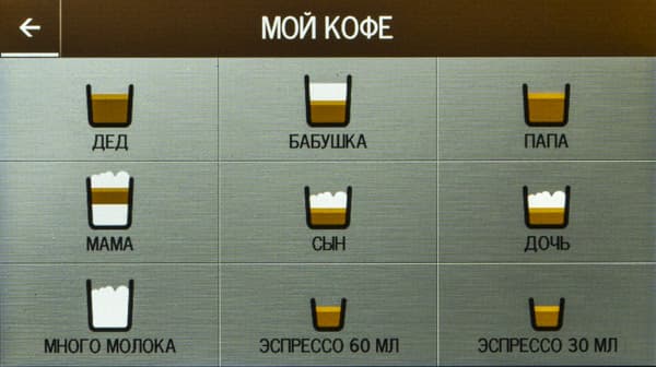 Если в семье владельца несколько любителей кофе со своими предпочтениями, то весьма полезной будет возможность создания и сохранения до 9 рецептов «Мой кофе» с собственными настройками, для именования которых используется кириллица.
