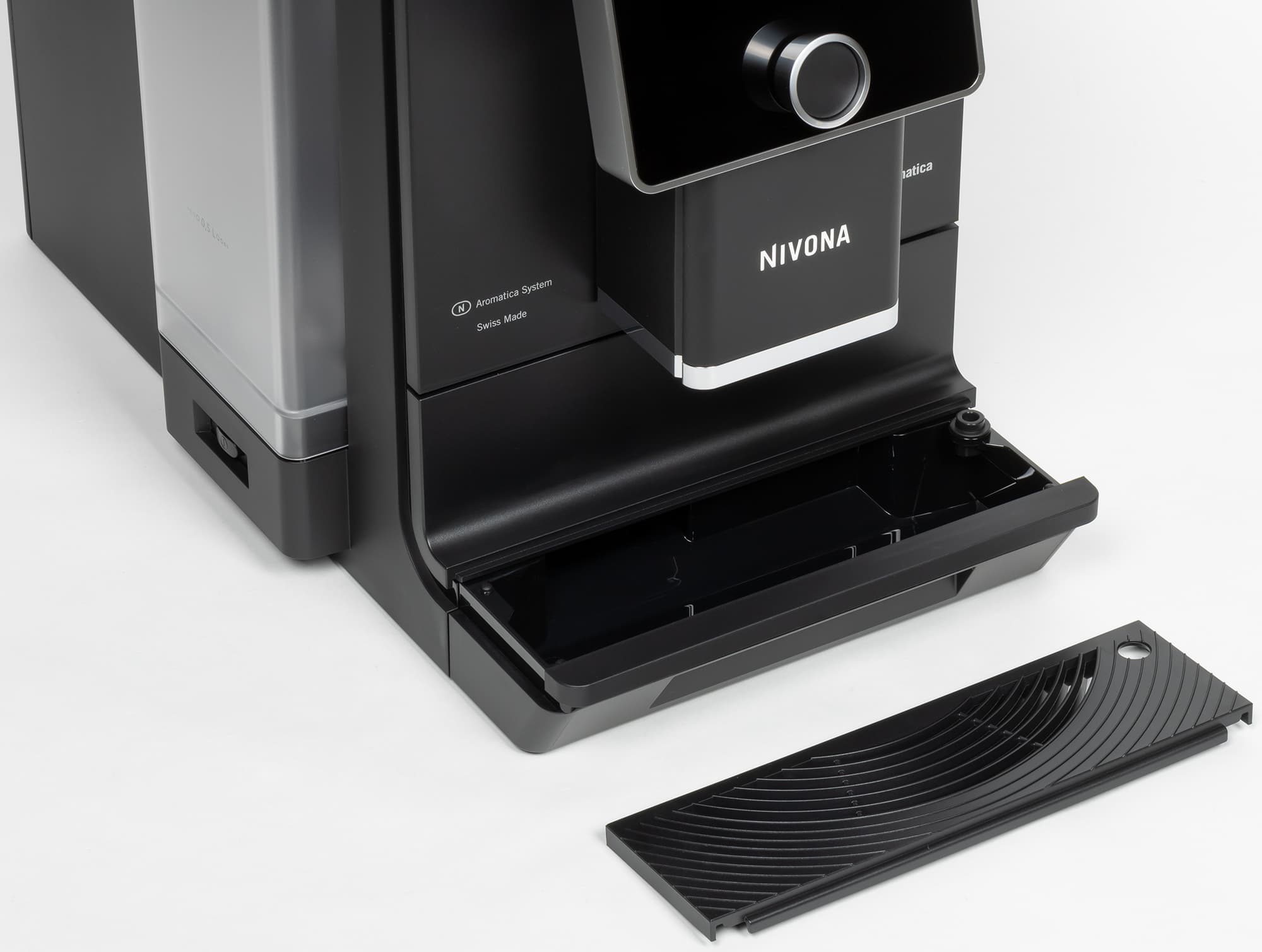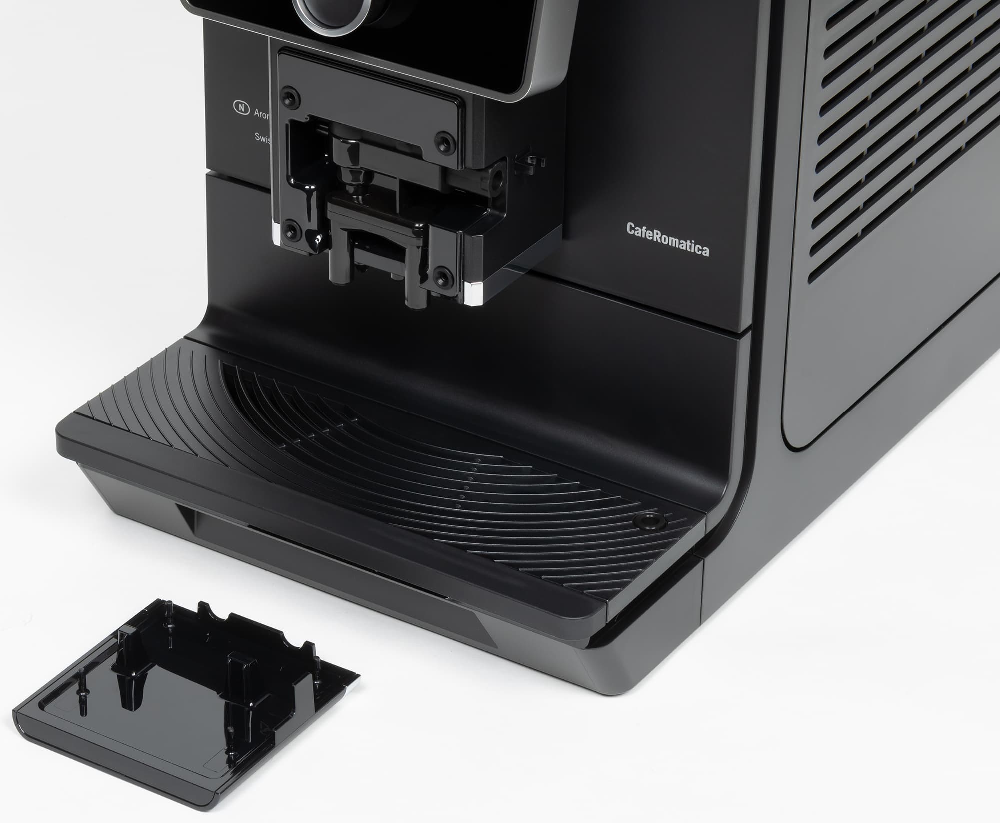 Поддон выступает вперед на 11 см, эта часть закрыта съемной решетчатой площадкой для чашек, имеющей отверстие для трубки молочного тракта (оно используется при промывке, а также чтобы в отсутствие контейнера с молоком было куда приткнуть конец трубки — это удобно).