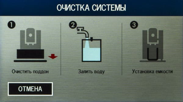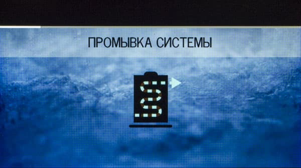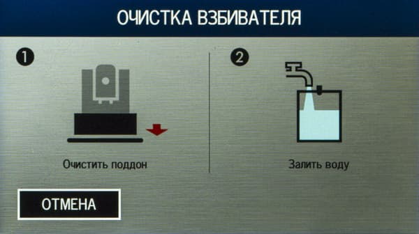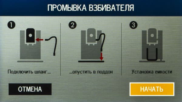 Вариантов шесть. Два из них относятся к взбивателю молочной пены — промывка (водой) и очистка (водой с добавлением моющего средства), два для системы (промывка водой и очистка с водой и чистящей таблеткой, помещаемой в отверстие варочного блока).