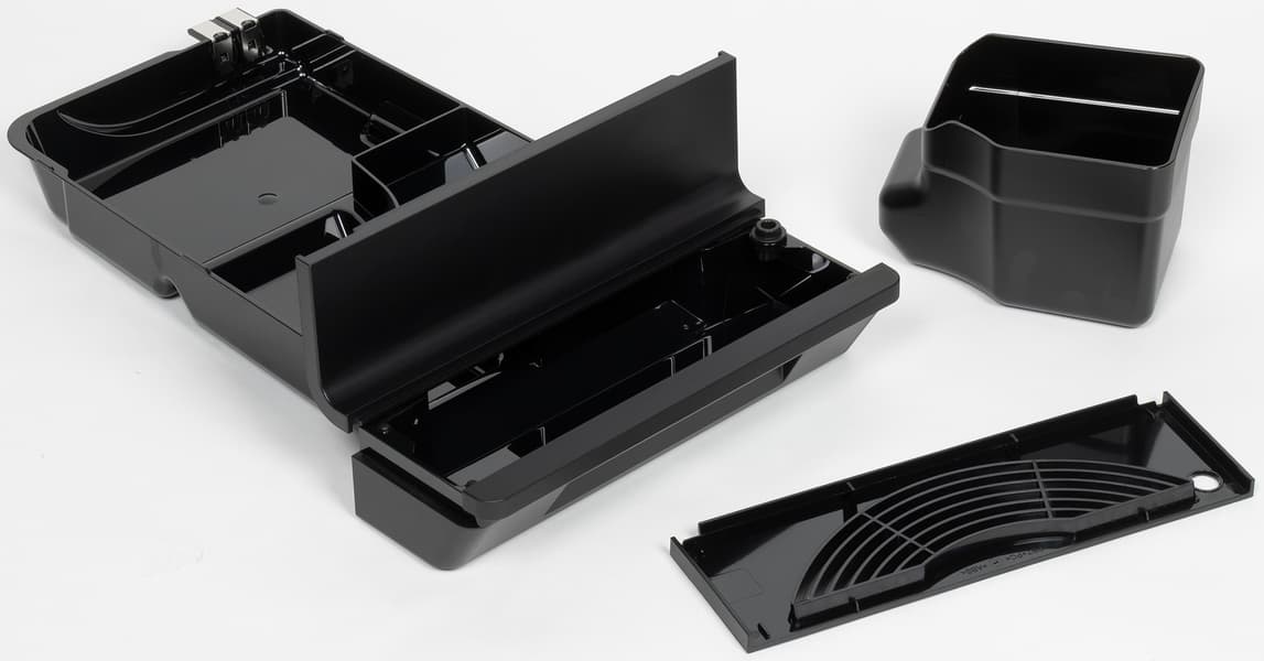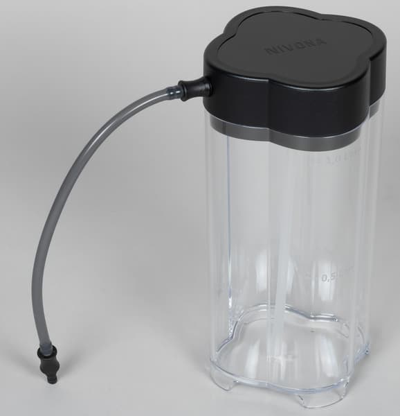 Контейнер для молока — сильно вытянутый в высоту (21 см) прозрачный кувшин с черной крышкой, который слегка расширяется снизу вверх: стороны в основании по 83 мм, у крышки по 90 мм. Он нормально устанавливается в «карман» на внутренней стороне дверцы холодильника, чтобы молоко не портилось и всегда было готовым к употреблению.
