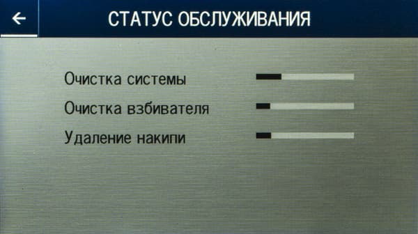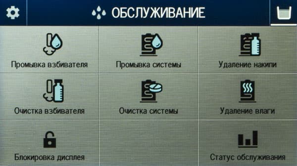 В меню обслуживания есть два дополнительных пункта, один вполне понятный и полезный — «Статус обслуживания», имеющиеся в нем диаграммы помогут оценить, как скоро потребуются очистки взбивателя, системы и удаление накипи. Второй пункт немедленно заблокирует сенсорный экран (напомним: разблокировка кнопкой «поворотного диска»), зачем это может потребоваться на практике — вопрос отдельный.