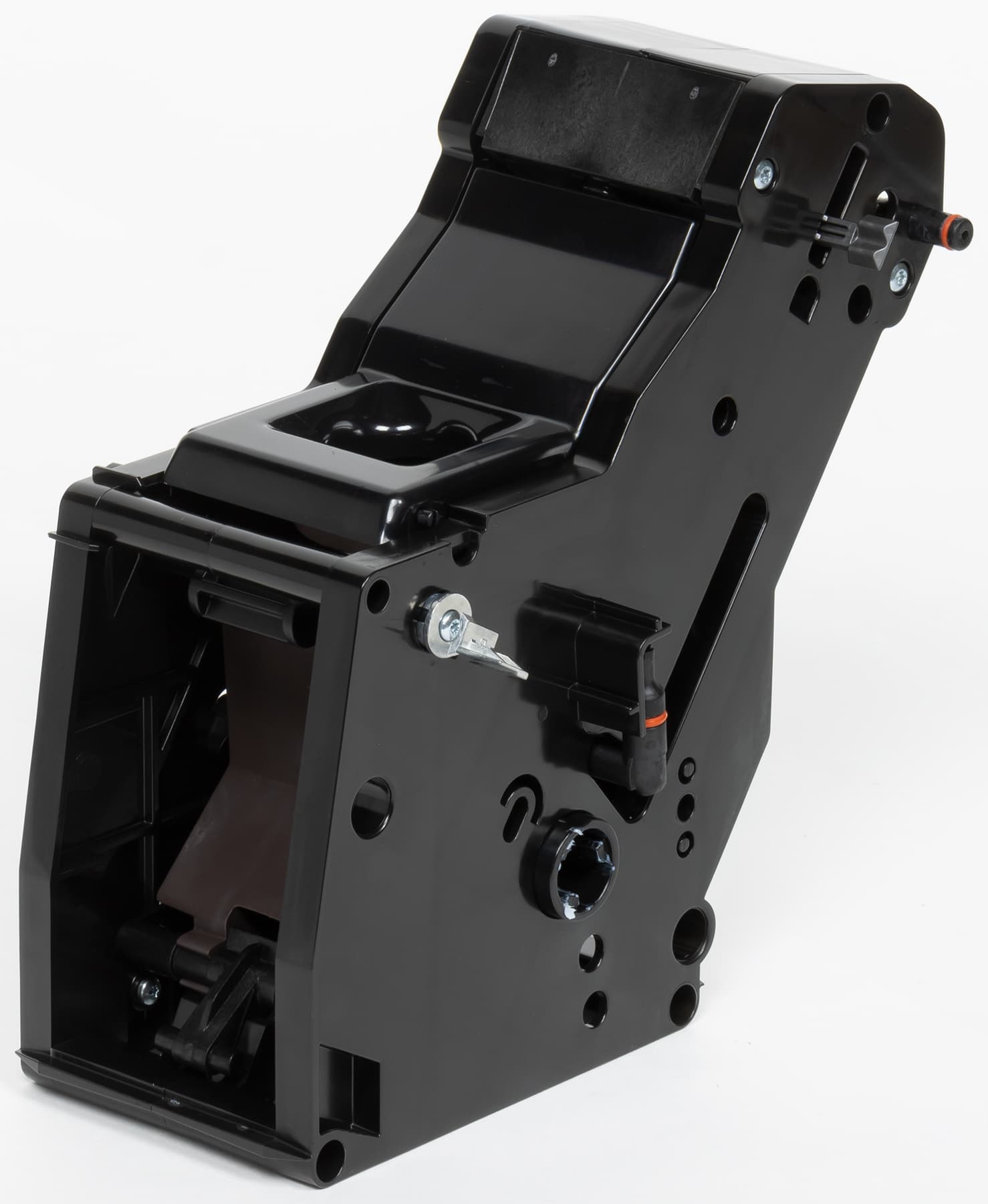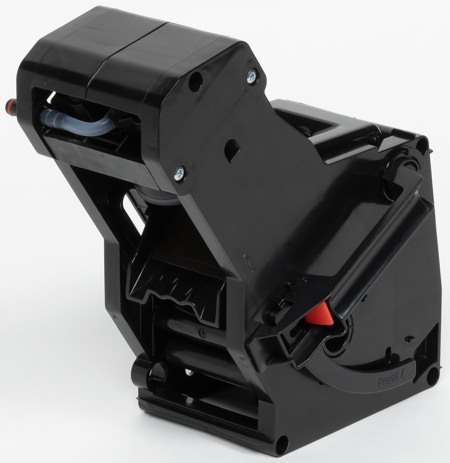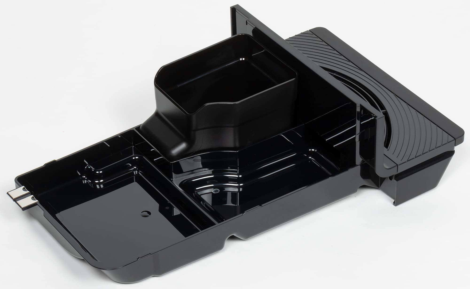 В самом низу спереди находится поддон для сбора капель. Он очень большой, занимает добрых три четверти днища аппарата, однако вместимость его с учетом особенностей алгоритмов функционирования кофемашины (об этом ниже) не очень велика — высота бортика всего 36 мм, и приходится часто выливать из него скопившуюся жидкость, для чего надо чуть приподнять его передний край и выдвинуть вперед, предварительно сдвинув вверх раздаточную группу. В задней части поддона есть два хорошо заметных контакта, которые надо держать чистыми и сухими.