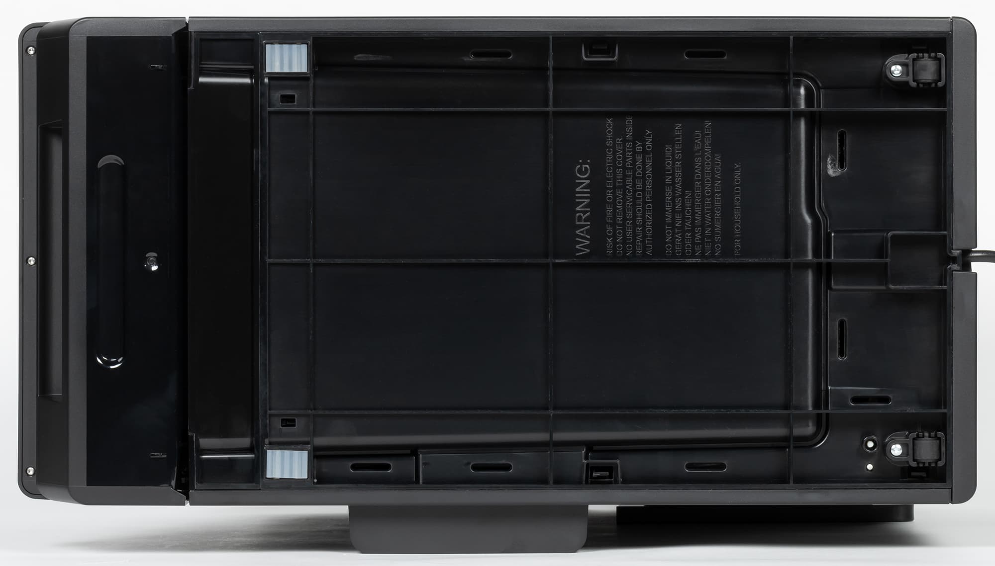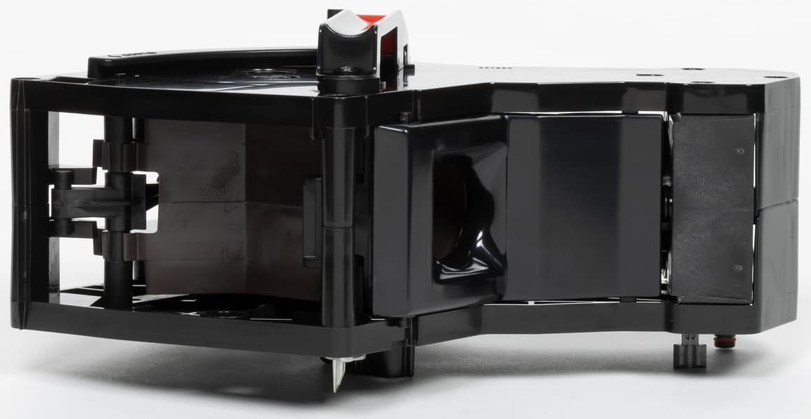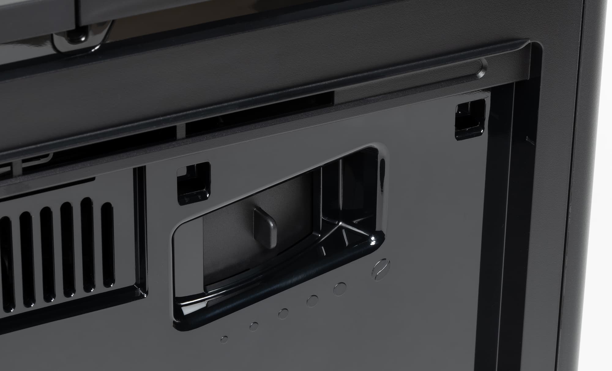 На нижней поверхности спереди имеются силиконовые ножки, а сзади обрезиненные колесики, которые позволят двигать увесистую кофемашину, приподняв только ее переднюю часть. Вот только не очень понятно, за что приподнимать: слева можно держаться за выступ с кнопкой Power, под которым есть небольшое пространство, а справа не за что — ухватиться можно разве что за край поддона, но есть опасение, что при этом что-нибудь может сломаться.