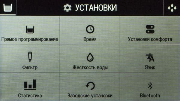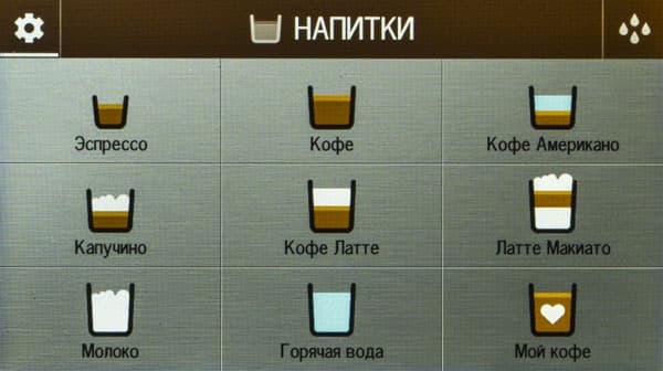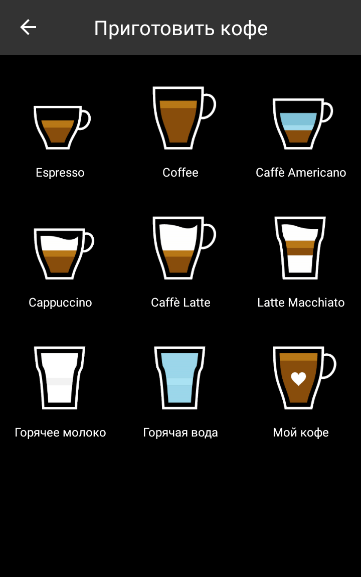 После включения отображается основная страница с организованным в виде набора плиток списком возможных напитков, их шесть: эспрессо, капучино, просто кофе (вероятно, аналог лунго) и кофе американо, латте и латте макиато. Плюс молоко со взбитой пеной, горячая вода (например, для чая) и переход к пользовательским рецептам «Мой кофе».