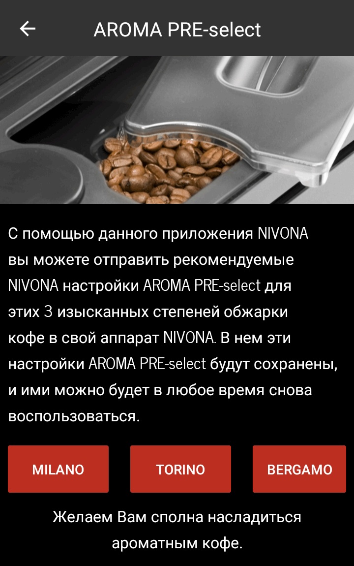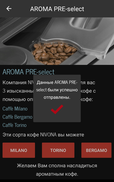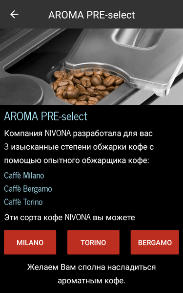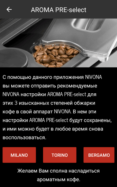 Выбираем соответствующий сорт, настройки пересылаются в кофемашину. Примерно так написано и в инструкции, но вот куда они пересылаются (точнее, на что именно влияют), мы понять не смогли — иногда после отправки того или иного сорта через «Aroma Pre-Select» приложения в настройках, например, для эспрессо меняется установка для «аромата», а иногда не меняется. И, конечно, на столь важную в плане влияния на вкус настройку, как степень помола, манипуляции с «Aroma Pre-Select» воздействовать не могут. По существу, предлагается верить заявлениям про «изысканный», «оптимальный», «с помощью опытного обжарщика» и заказывать килограммовые пакеты кофе Nivona в надежде, что ваши понятия об оптимальности и изысканности совпадут со вкусами разработчиков кофемашины.