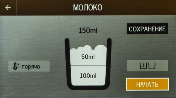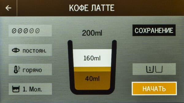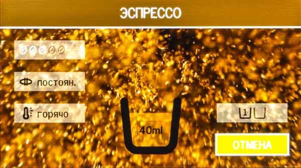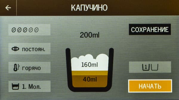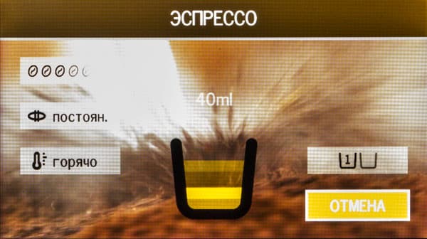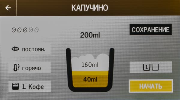 Некоторые параметры можно менять и во время приготовления, после начала которого отображается экран с соответствующими настройками, главное здесь — не упустить момент: изменить, например, количество молока после того, как оно уже налилось, не получится. Уже начавшееся приготовление можно отменить или прекратить в любой момент (например, если видим, что чашка маловата для выбранного объема).