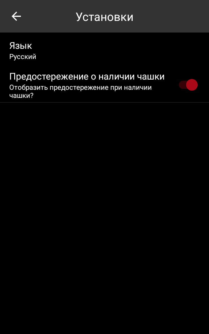 Там же включается или выключается предупреждение об установке чашки, которое будет (или не будет) предварять любое приготовление напитка. Сформулировано не очень удачно: подстрочный комментарий говорит о предупреждении «при наличии чашки», и его надо понимать как в названии настройки — «предупреждение о наличии».