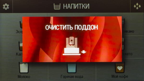 Заполнение поддона для капель и емкости для кофейных отходов отслеживается не на физическом уровне «полный / пустой», а по счетчику: сделали N чашек, извольте опорожнить. Даже без таких напоминаний мы регулярно выливали из поддона скопившуюся жидкость и удаляли жмых, но требования очистки возникали и вскоре после этих действий.