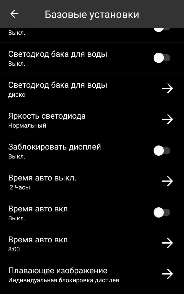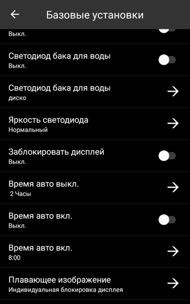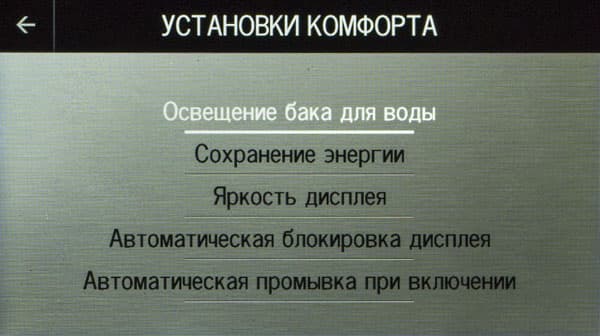 «Установки комфорта»: шесть пунктов, включая уже упоминавшиеся настройки освещения бака для воды. Еще одна, вполне понятная — яркость дисплея (три градации).