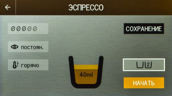 Если выбираем в настройке рецепта две чашки, то одна за другой производятся две процедуры приготовления, включая два помола. Конечно, все это можно наливать и в один бокал, лишь бы его емкость была соответствующей.