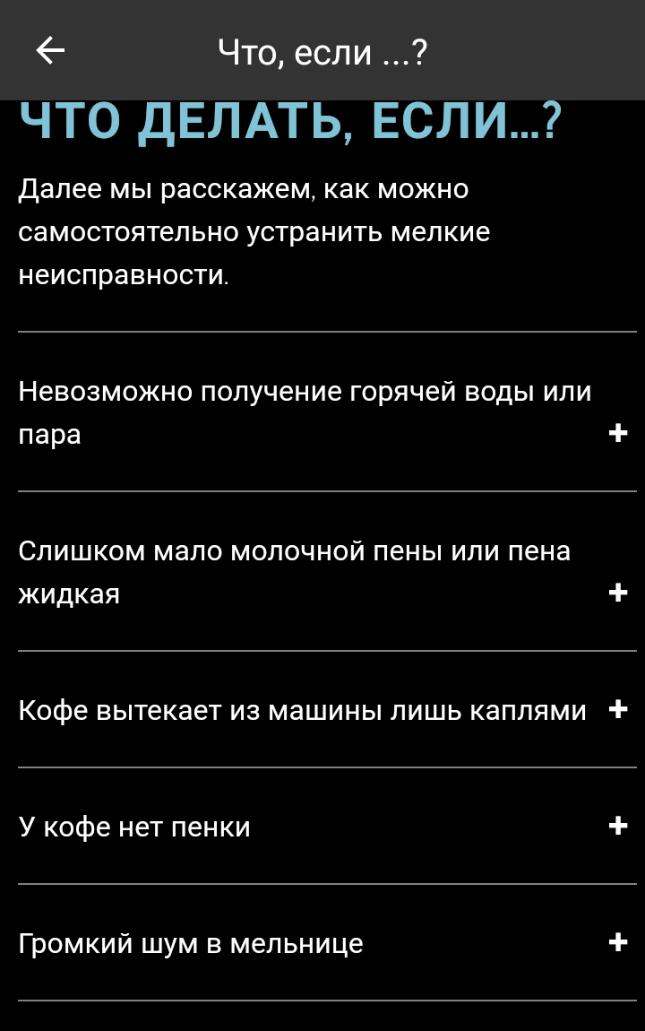 Не обошлось и без «ложки дегтя»: приложение не позволит обращаться к набору индивидуальных рецептов, сохраненных в разделе «Мой кофе». Такая кнопка присутствует на экране приложения, но отобразит она единственную иконку «Mein Kaffee», нажатие на которую (хоть длинное, хоть короткое) после некоторого ожидания даст лишь экран с той же кнопкой. Остается надеяться, что в следующих версиях приложения (у нас была 3.4.2) это дело поправят.