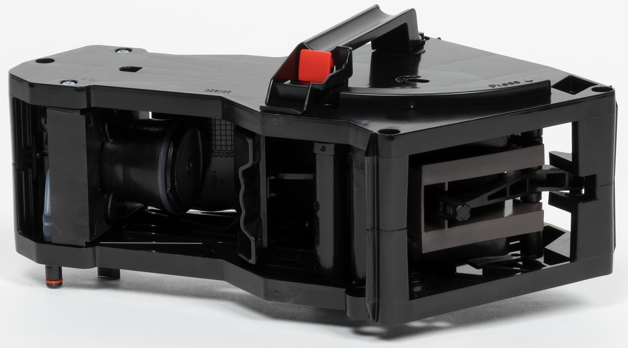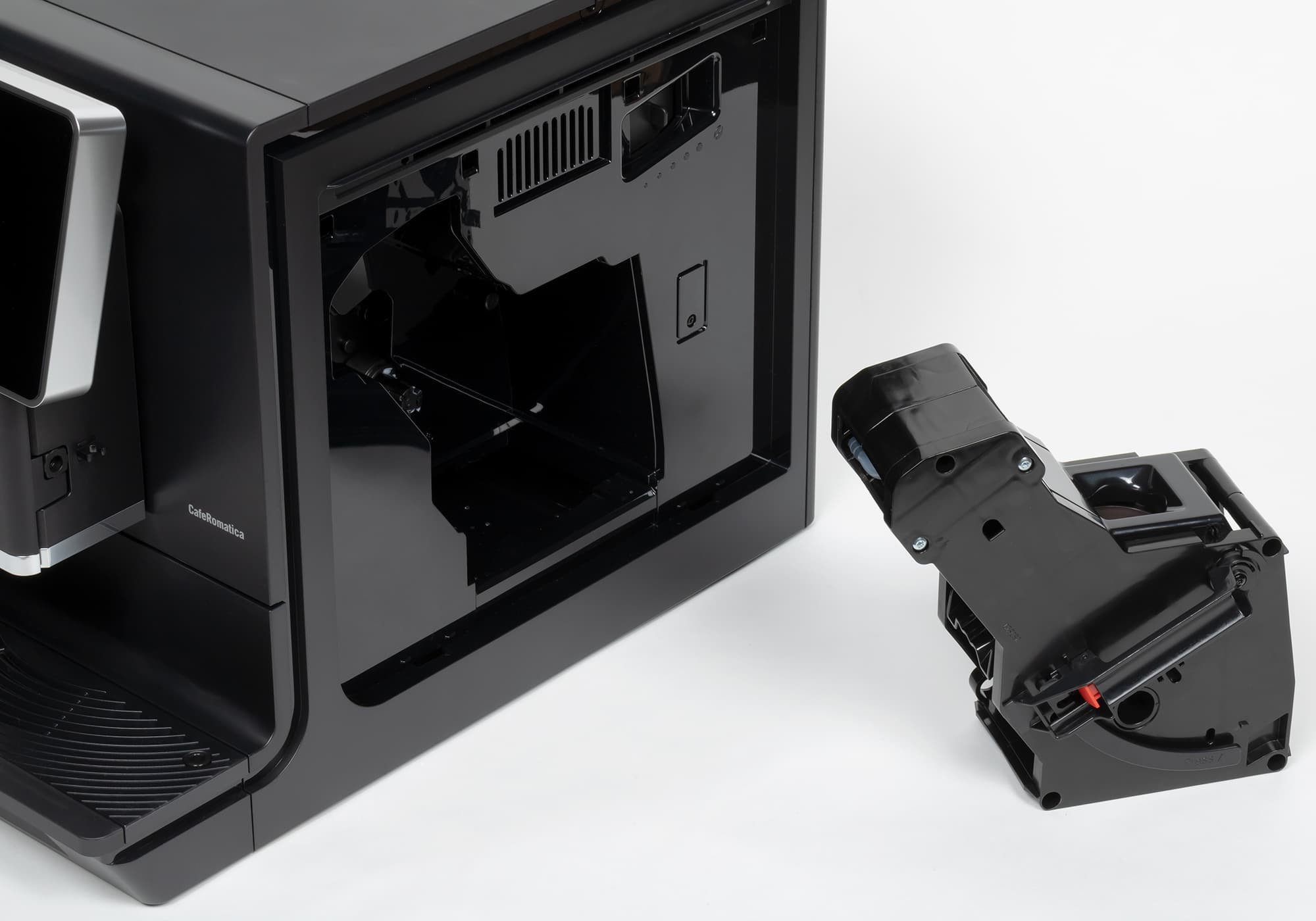 Ниже расположен варочный блок (мы пользуемся терминами инструкции), который придется извлекать при обслуживании, его рекомендуется проводить ежемесячно. Поэтому устанавливать кофемашину в совсем уж узкую нишу не надо: это чревато и перегревом, о чем предупреждает инструкция, и неудобствами при извлечении блока и регулировке помола.