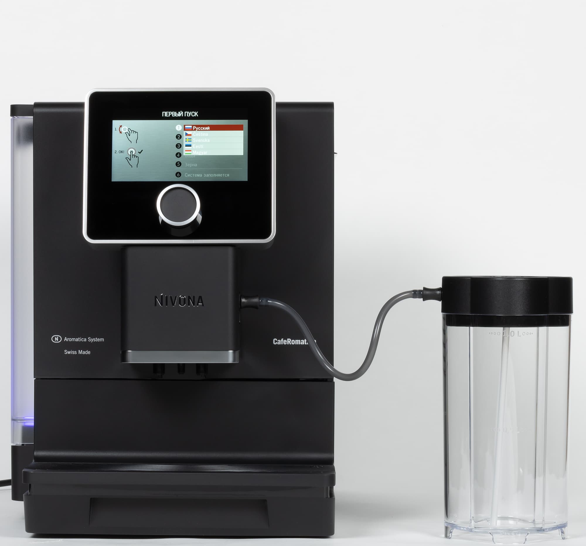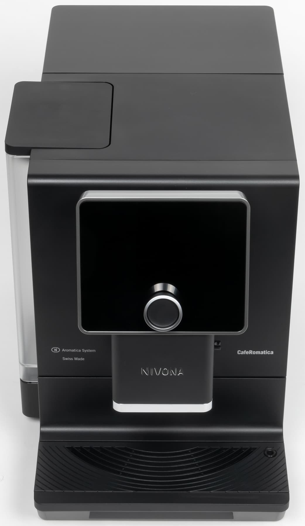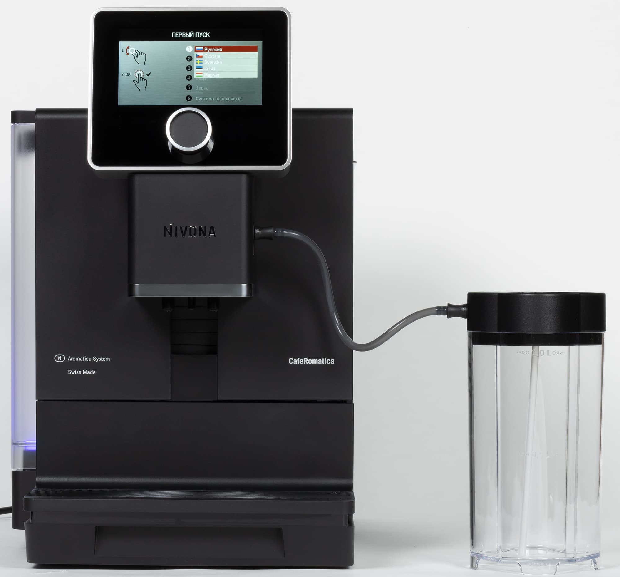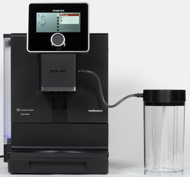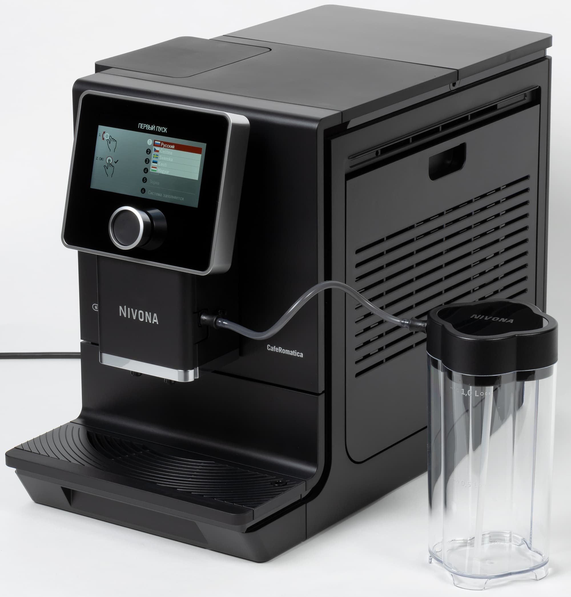 NICR 930 — новинка, она даже отсутствовала в русскоязычном разделе сайта nivona.com на момент подготовки обзора, хотя вовсю предлагалась в российской рознице. У нее иная конфигурация панели управления: ЖК-экран поменьше и не сенсорный, управлять работой и настройками нужно с помощью «поворотного диска», соответственно прямоугольник панели повернут на 90 градусов по сравнению с моделями 960/970. Нет подсветки бака с водой, цвет корпуса серебристый, цена на 10 тысяч рублей ниже.