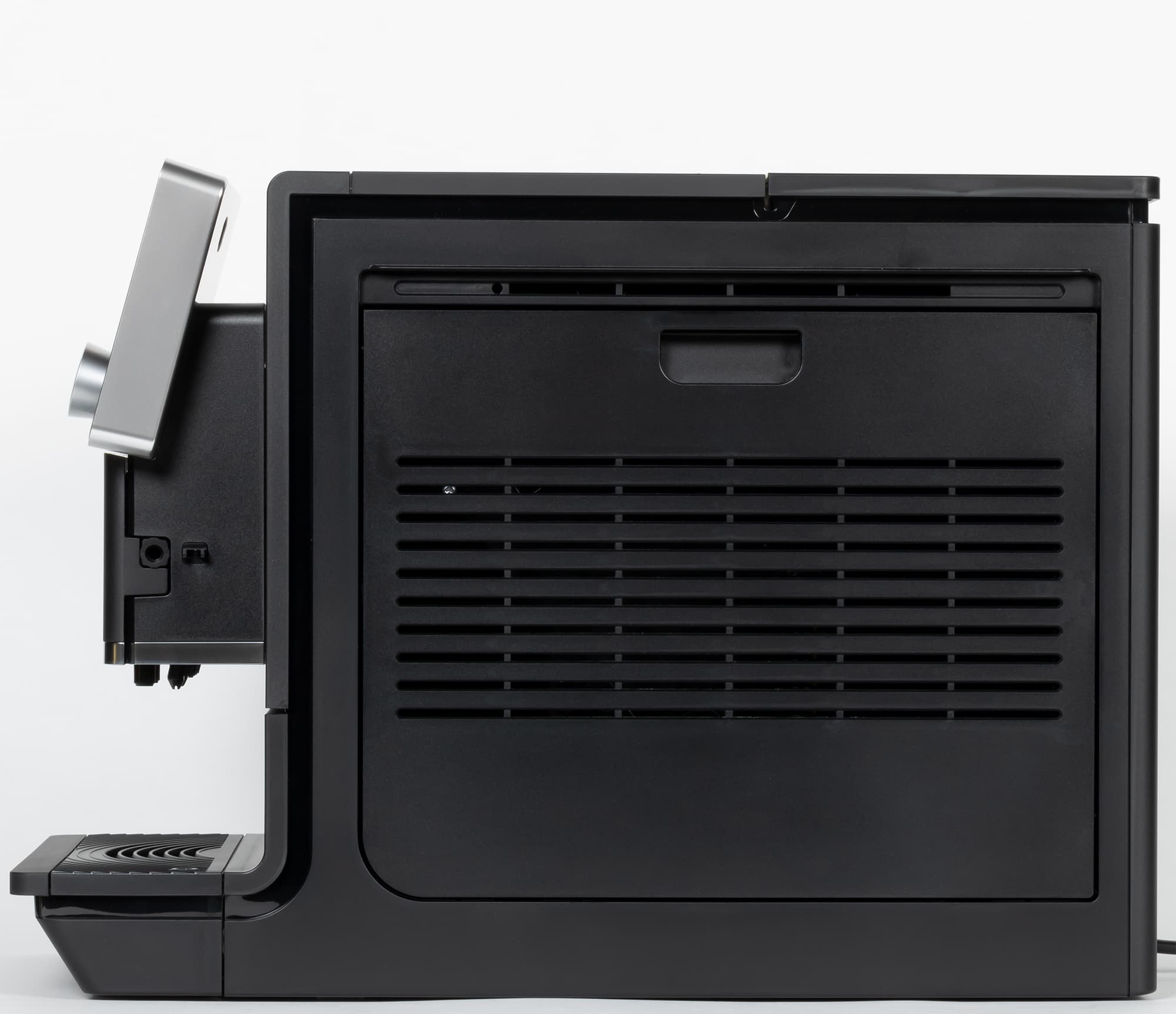 Слева сбоку немного выступает прозрачный бак для воды емкостью 2,2 литра. Сверху он закрывается откидной крышкой, которая является частью не самого бака, а верхней плоскости машины. Чтобы при установке в нишу или под нависающей полкой можно было открыть эту крышку и вытащить бак, поднимая его за поворотную ручку, нужно свободное пространство минимум в 11-12 сантиметров, оно позволит и засыпать зерна или молотый кофе. Но лучше, чтоб сверху было не меньше 14-15 см, будет удобнее.
