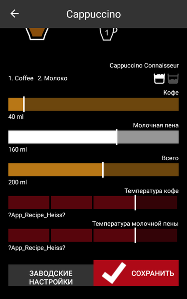 Но есть и более существенные настройки, отсутствующие в меню самой машины. Речь про температуру приготовления; как мы видели выше, есть четыре градации, которые, видимо, относятся к напитку в целом. А в приложении Nivona App для рецептов с молоком можно отдельно задавать температуру для кофе, молока и молочной пены; насколько все это будет влиять на конечный результат, каждый владелец сможет определить сам, и не факт, что сочтет ее полезной, но наличие какой-то настройки всегда лучше отсутствия. Вот только русификация для этих установок почему-то потерялась.