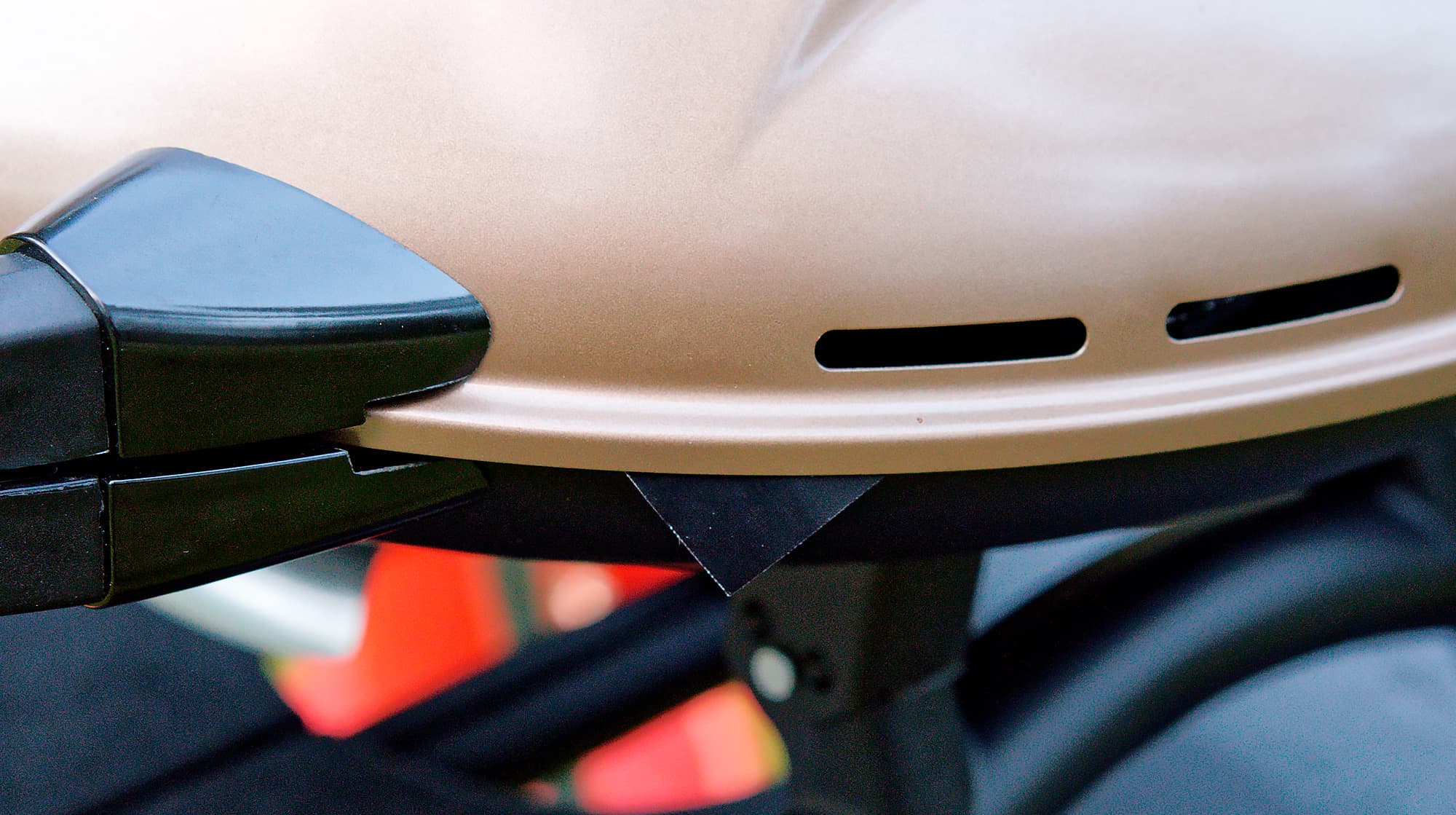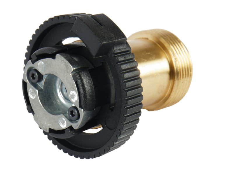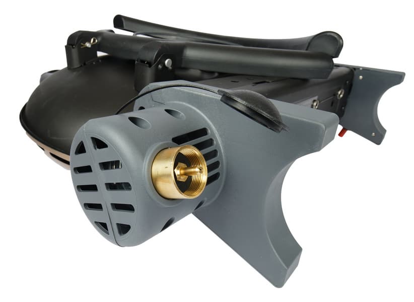На левой тыльной стороне расположен латунный штуцер, закрытый пластиковым черным предохранительным колпачком — это место подсоединения баллонов, шланга и различных адаптеров. Судя по инструкции, напрямую, без адаптеров, подключаются баллоны Cooleman и BernZomatic, но мы не проверяли.