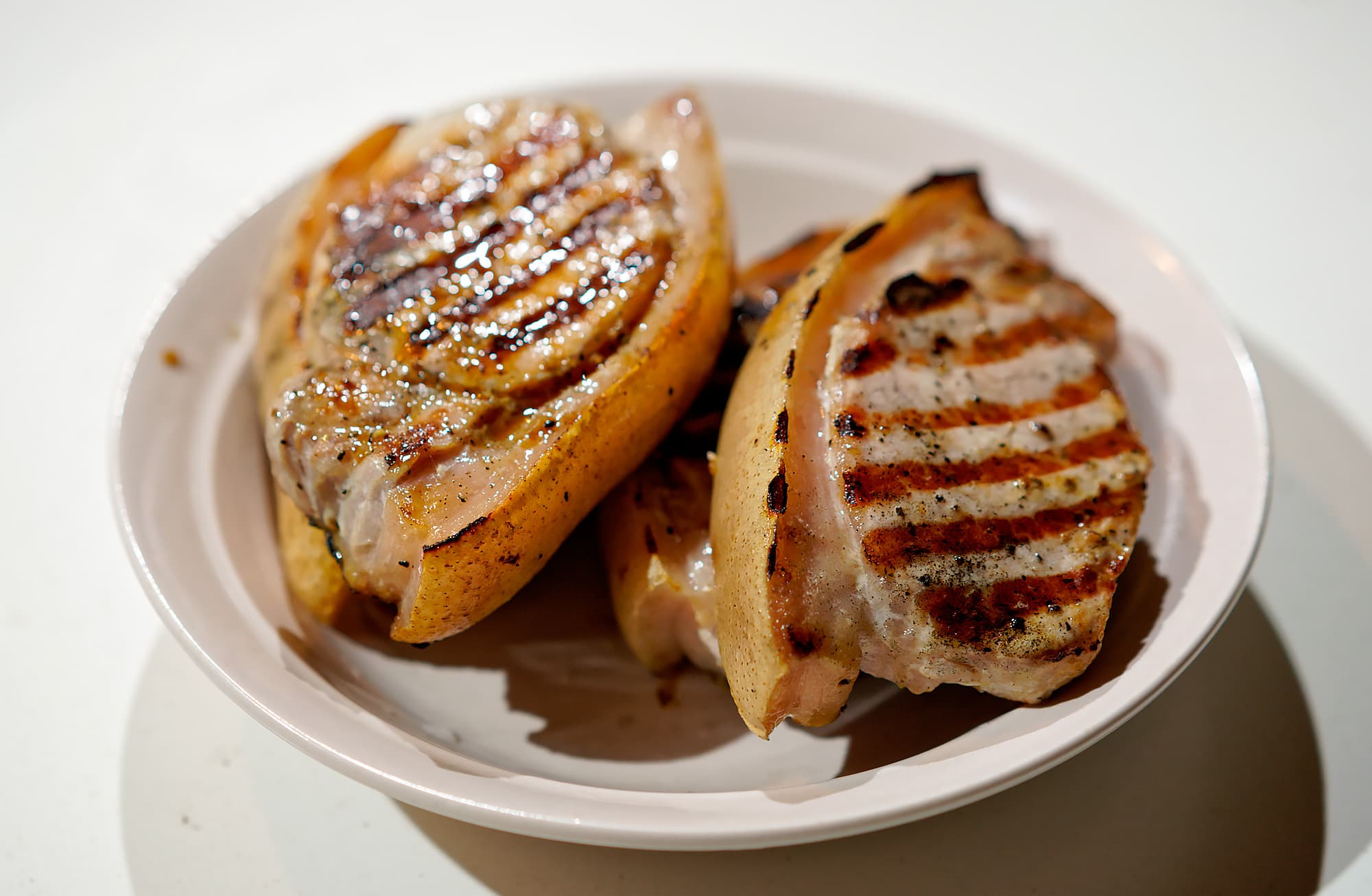 Положили на гриль и обжарили со всех сторон, часто переворачивая. Итог — сочное и нежное внутри, прогретое до теплого состояния и слегка поджаренное снаружи.