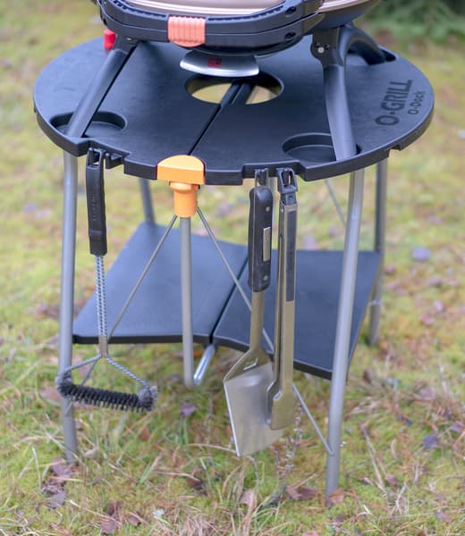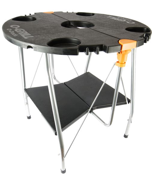 С прочими аксессуарами будем знакомиться в рабочем порядке, скажем лишь пару слов про столик. В сложенном состоянии он плоский, раскладывается одним движением, вполне интуитивно понятным. Садиться на него мы бы не рискнули, но 10-килограммовый гриль и его содержимое столик выдерживает хорошо: не гнется, не шатается. Гриль на него устанавливается путем помещения четырех ножек в соответствующие выемки на поверхности стола.
