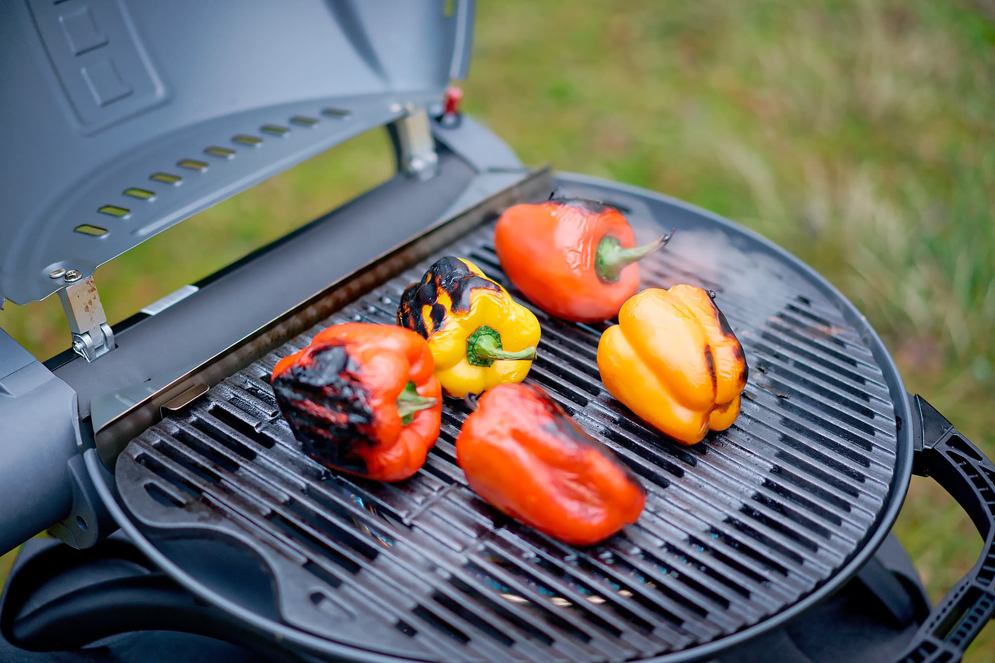 Пеклись перцы довольно быстро. Гриль — это не духовка, непрямого нагрева тут нет, поэтому мы их несколько раз переворачивали, но потом крышку сразу закрывали: это гарантия того, что те места, которые непосредственно не прикасаются к решетке гриля, тоже пропекутся.