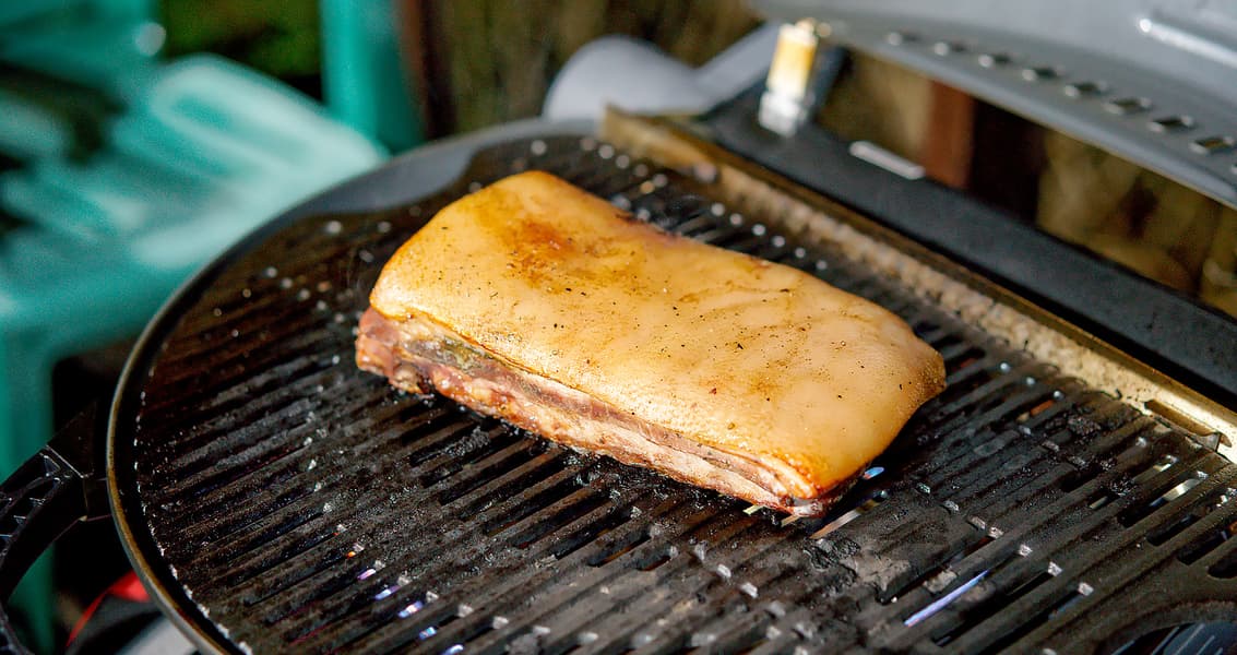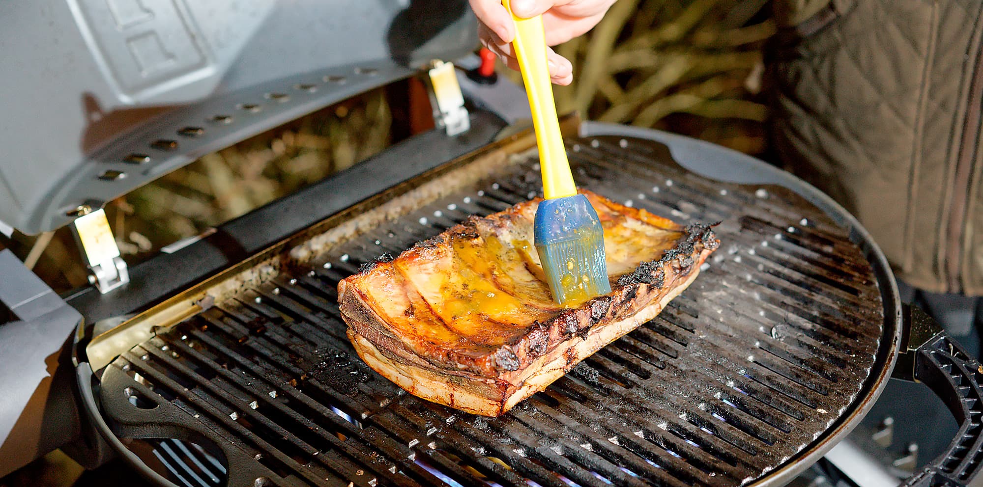 Это фрагмент того же копорского поросенка: на этот раз небольшие ребрышки. Не забываем, что наш O-Grill 900MT — не угольная барбекюшница и не большое красное яйцо, где мясо можно и нужно томить полдня в режиме духовки. А что же нам делать с ребрами на гриле? Несомненно, можно их просто обжарить, переворачивая в процессе, и съесть.