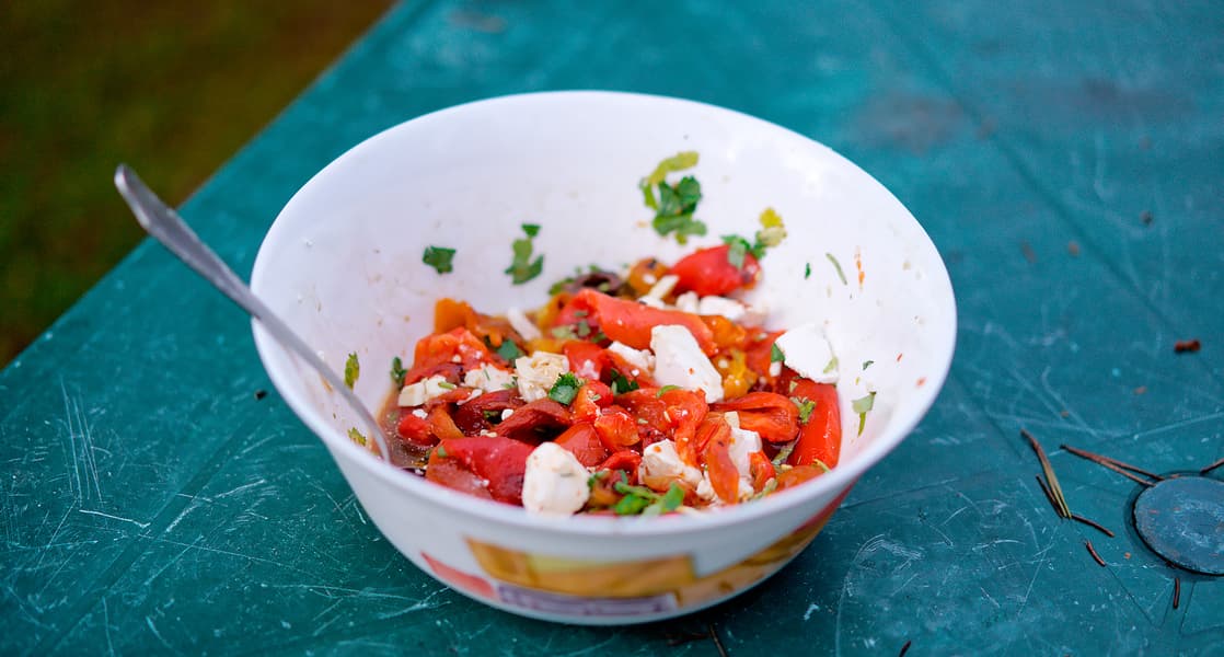 Далее экспериментируем с высоким нагревом. Перцы нужно запечь до обугливания кожицы, чем мы и занялись. Баллончик все тот же — маленький туристический. Делать точные замеры бессмысленно, но для ориентира будет полезно знать, что его хватило на четыре полноценных блюда и внутри еще плескалось содержимое. Получается, что цанговый баллон в день — максимальный расход на компанию из 4-6 человек, и если вам лень таскать в багажнике большой газовый баллон, на эту цифру и надо ориентироваться.