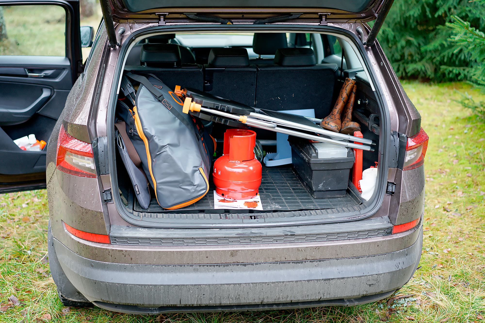 Начнем с самого начала, а поскольку наш гриль является мобильным, это будет транспортировка на место использования. Вот так выглядит O-Grill 900MT с комплектом аксессуаров в не таком уж маленьком багажнике кроссовера Škoda Kodiaq (635 л). Мы специально не занимались бережной укладкой и тщательной оптимизацией пространства, сымитировав достаточно частую ситуацию «побросали и поехали».