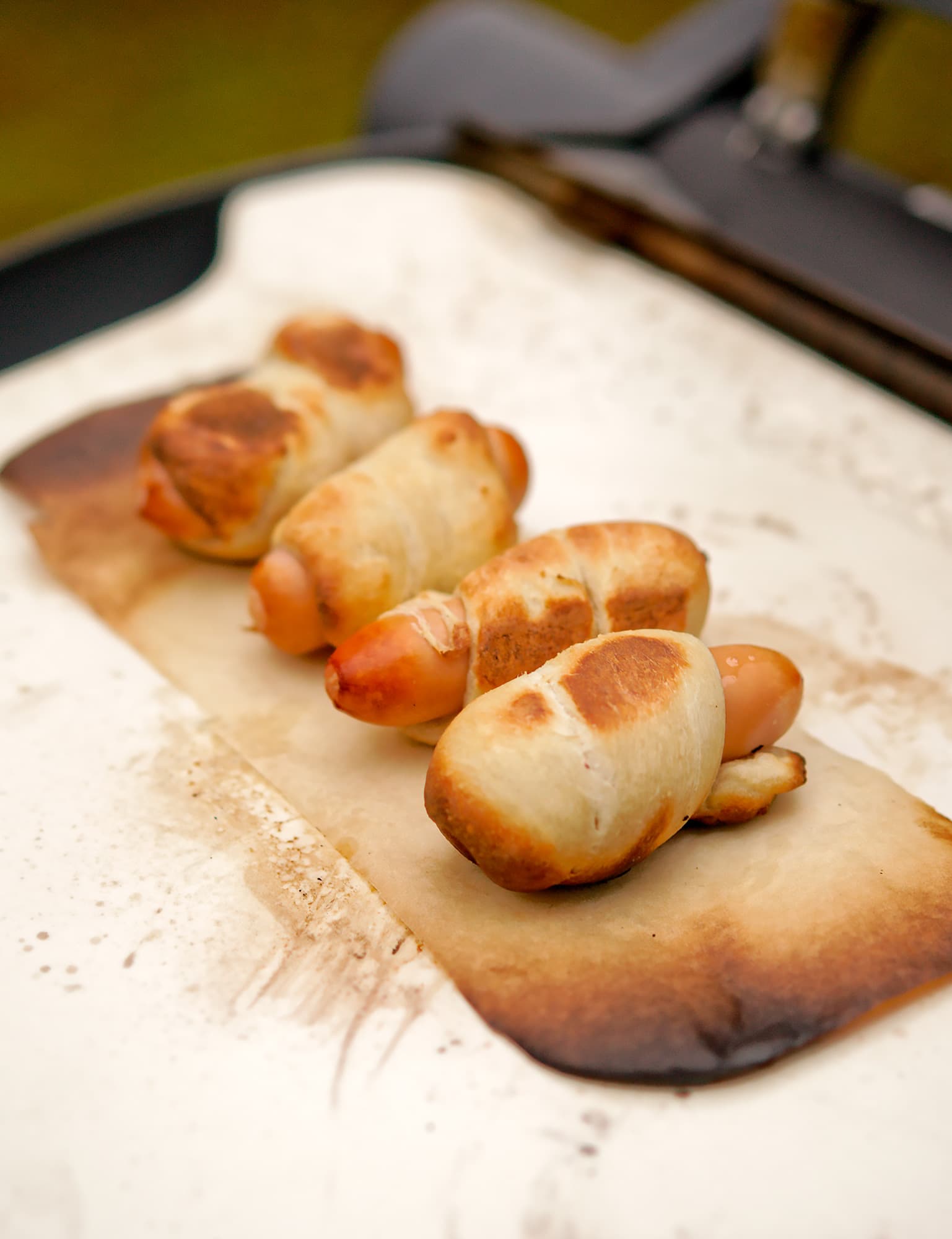Понятно, что у нас не барбекю, а гриль, но хотелось немного похулиганить. Мы обернули несколько сосисок остатками теста и попробовали выпечь сосиски в тесте на камне для пиццы.