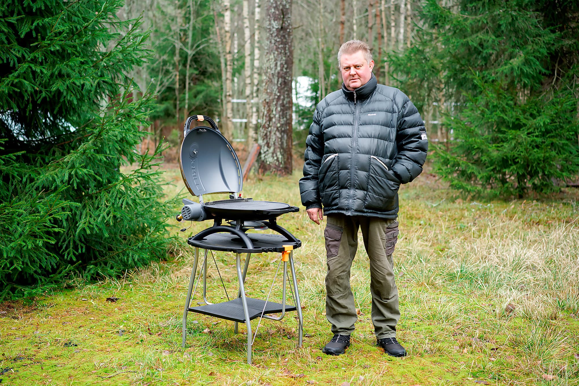 Как мы уже писали ранее, поставить гриль на столик можно как угодно, хотя пожелания разработчиков из конструкции понять можно. Мы, разумеется, с первого раза сделали все неправильно... и целые сутки этого не замечали. Заметили только тогда, когда попытались положить что-то на встроенную в столик полочку — в «неправильном» положении, стоя лицом к грилю, сделать это сложнее: мешает штанга. Но в остальном — вообще ни на что не влияет. Для масштаба на фото присутствует мужчина ростом 180 см в наряде, типичном для условий тестирования.