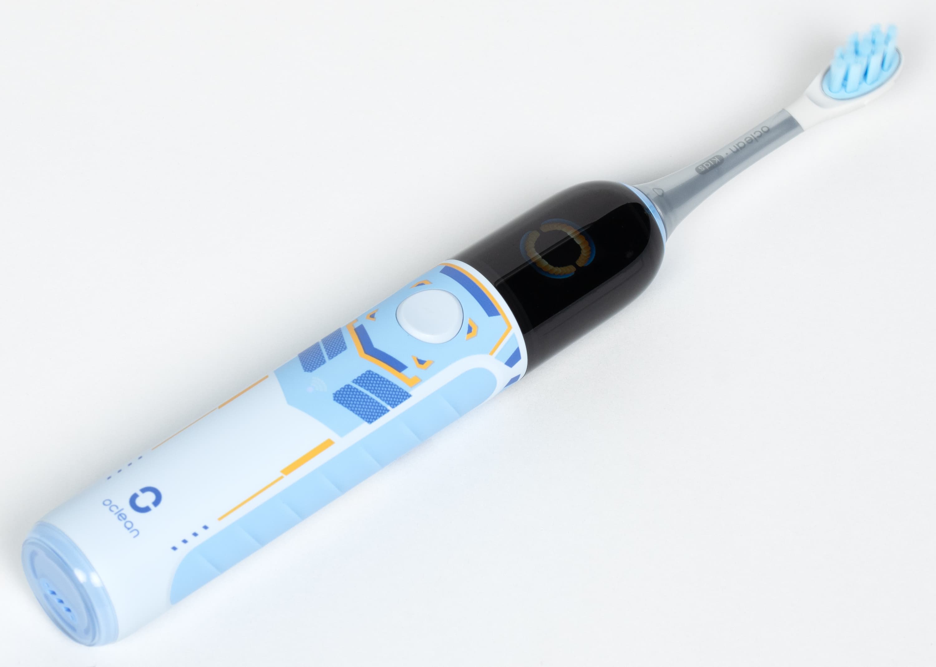 Управление зубной щеткой Oclean X Kids Pro происходит при нажатии на единственную имеющуюся на корпусе кнопку. На фото ниже смешная рожица инопланетянина (?), также виден значок Wi-Fi, пока еще не подключенного.