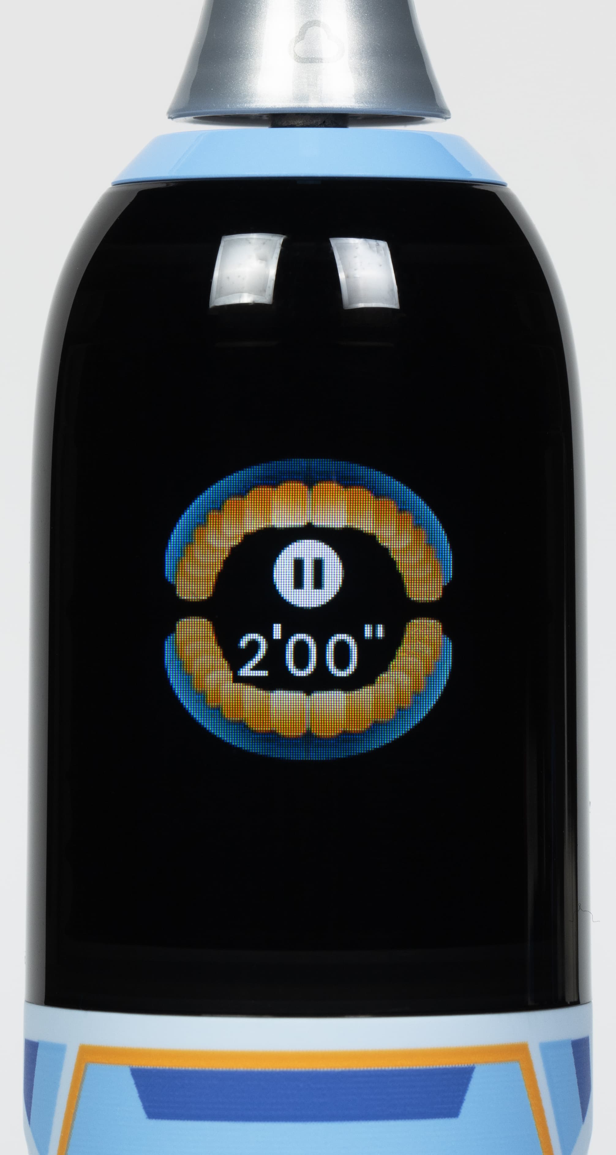 При нажатии на кнопку зубная щетка включается, и появляется изображение челюстей с зубами; отображается время чистки зубов, рекомендуемое стоматологами — 2 минуты. После окончания чистки щетка автоматически отключается.