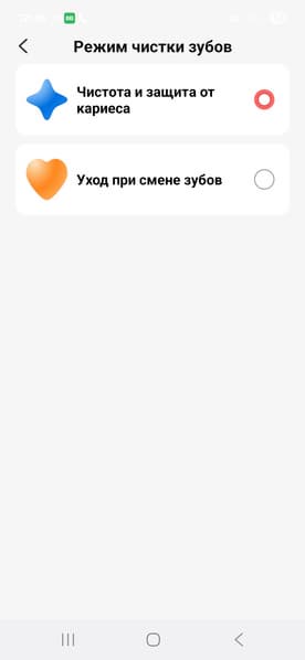 На выбор предлагается два режима чистки: чистота и защита от кариеса и уход при смене зубов (что как раз вполне подходит для детей, в отличие от красного вина).