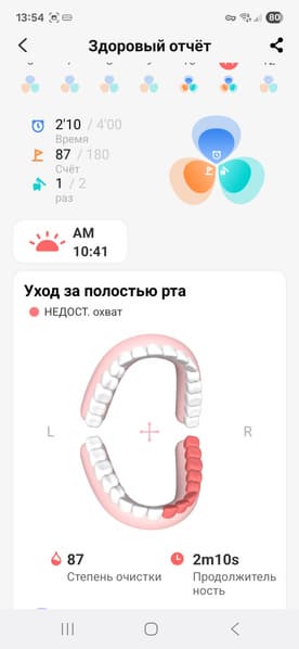 Ниже показан «Здоровый отчет» с детальной информацией о чистке зубов. Показаны недостаточно почищенные области, а также советы и рекомендации ассистента. Что интересно, рекомендации отличаются друг от друга, а не повторяются один в один. Другой вопрос, что ребенок, для которого предназначена данная зубная щетка, вряд ли сможет воспользоваться рекомендацией бросить курить и ограничить употребление алкоголя.