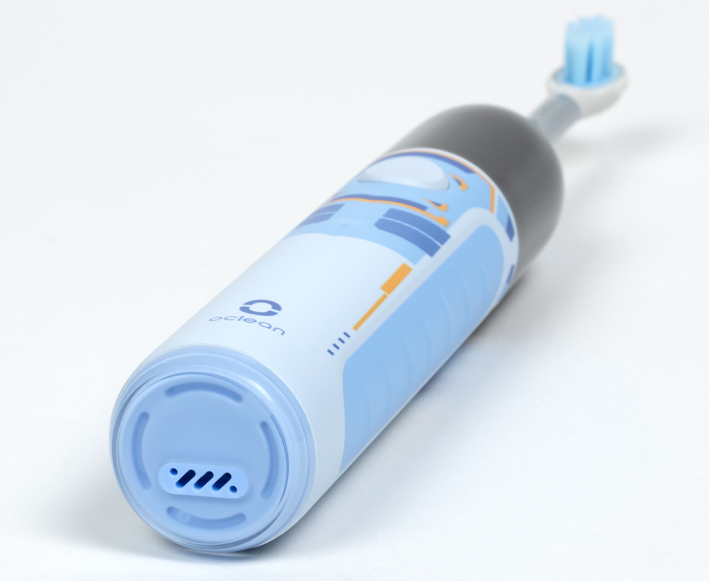Нижняя поверхность щетки закрыта крышкой, защищающей гнездо подключения зарядного кабеля от влаги.