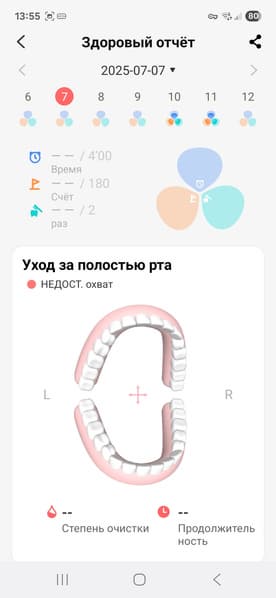 Ну а дальше мы перейдем к недостаткам работы приложения. На скриншоте ниже показан «Здоровый отчет» за несколько дней. Видно, что ярко горят иконки от 10 и 11 июля, т.е. зубы, по мнению приложения, чистились только в эти два дня, хотя (честное слово!) мы чистили зубы и в остальные дни.