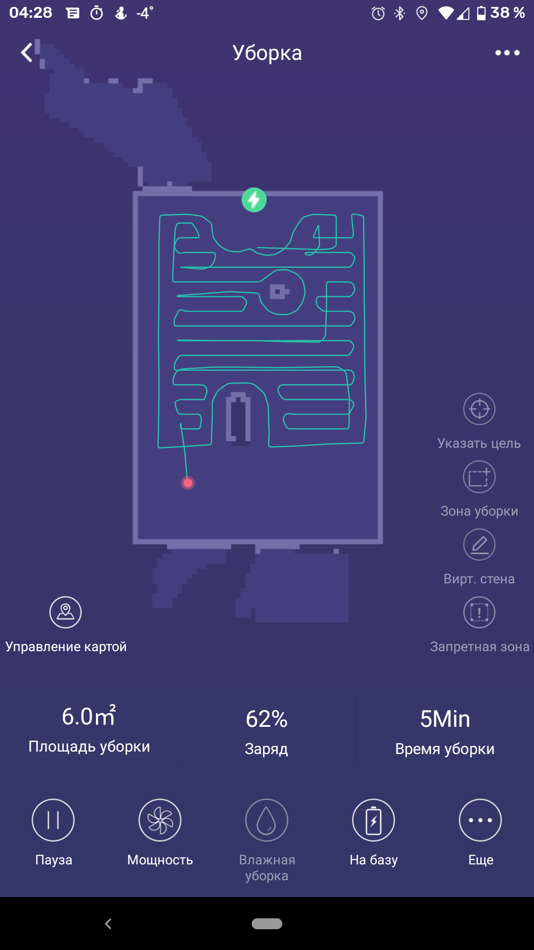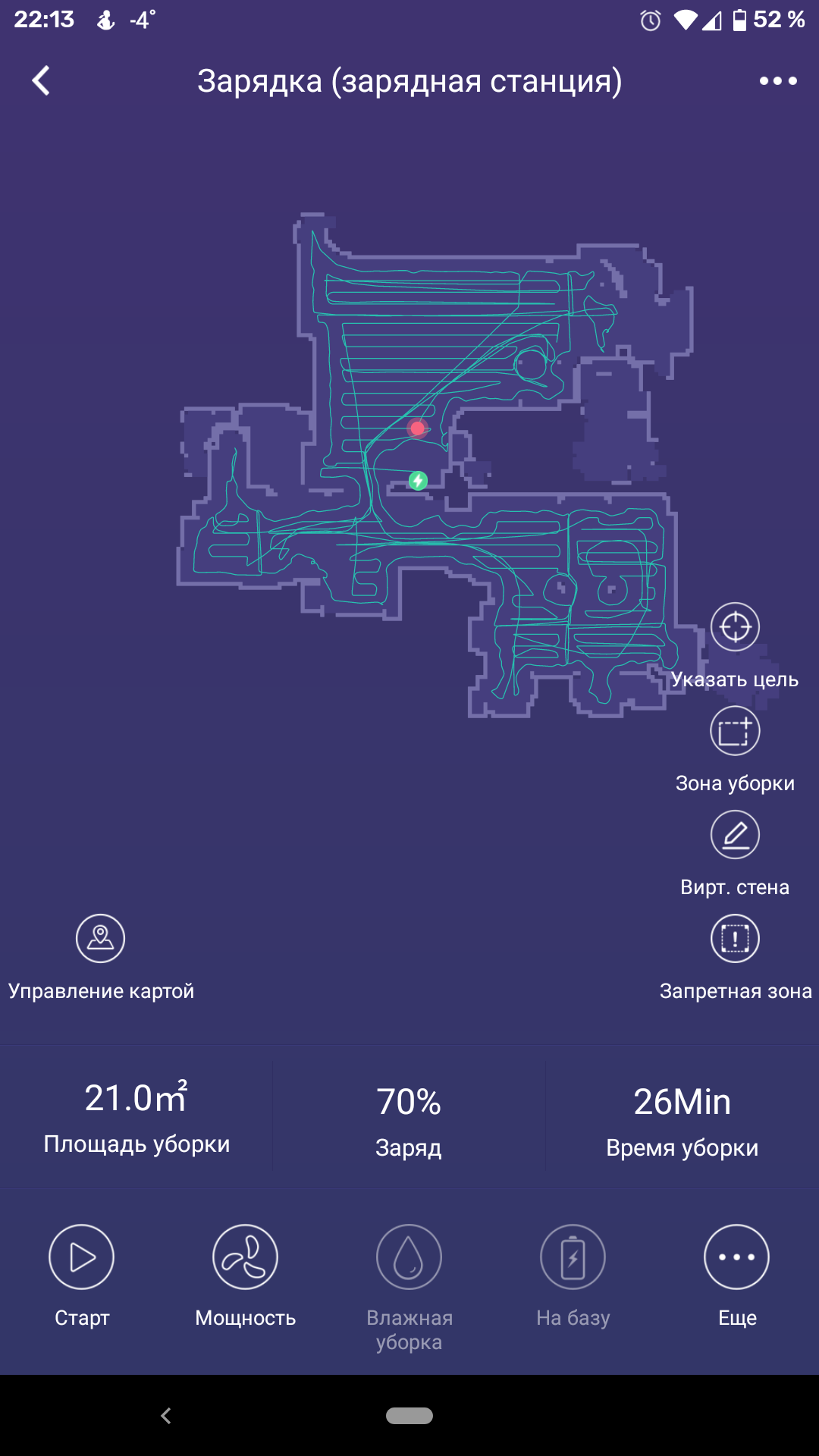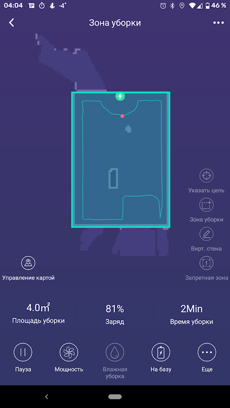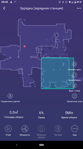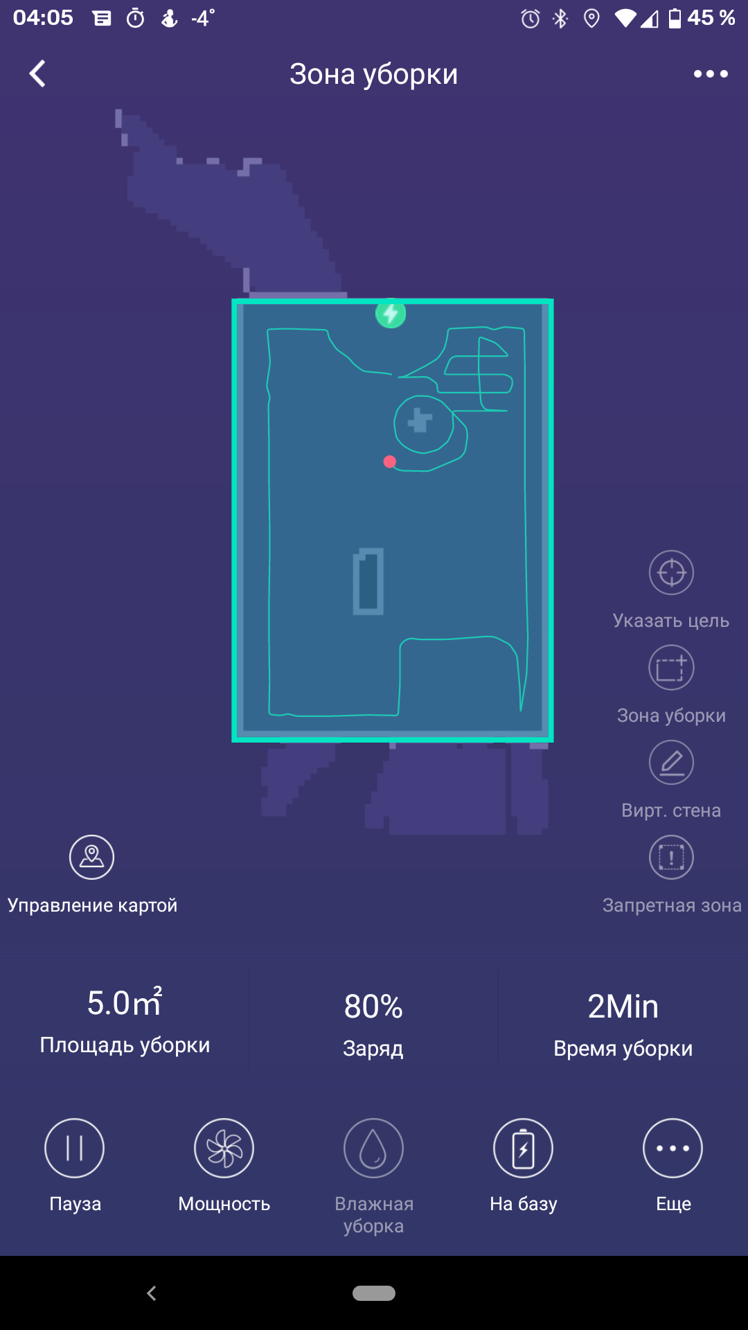 Интерфейс главного экрана очень напоминает аналогичное приложение пылесоса 360 S7, который мы рассматривали не так давно: те же самые кнопки управления режимами работы робота, расположенные внизу; такие же индикаторы площади уборки, состояния аккумулятора и продолжительности работы. Инструменты редактирования карты, которые позволяют установить зоны уборки, запретные зоны, виртуальные стены и точки локальной уборки, размещены в правой части экрана.