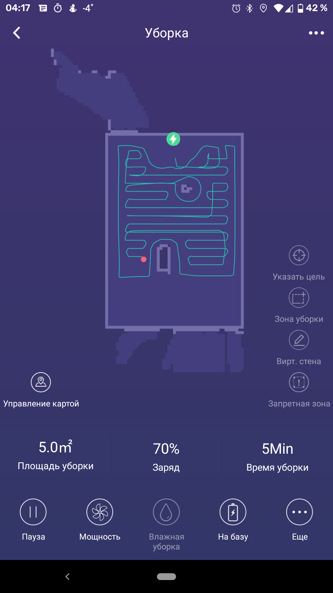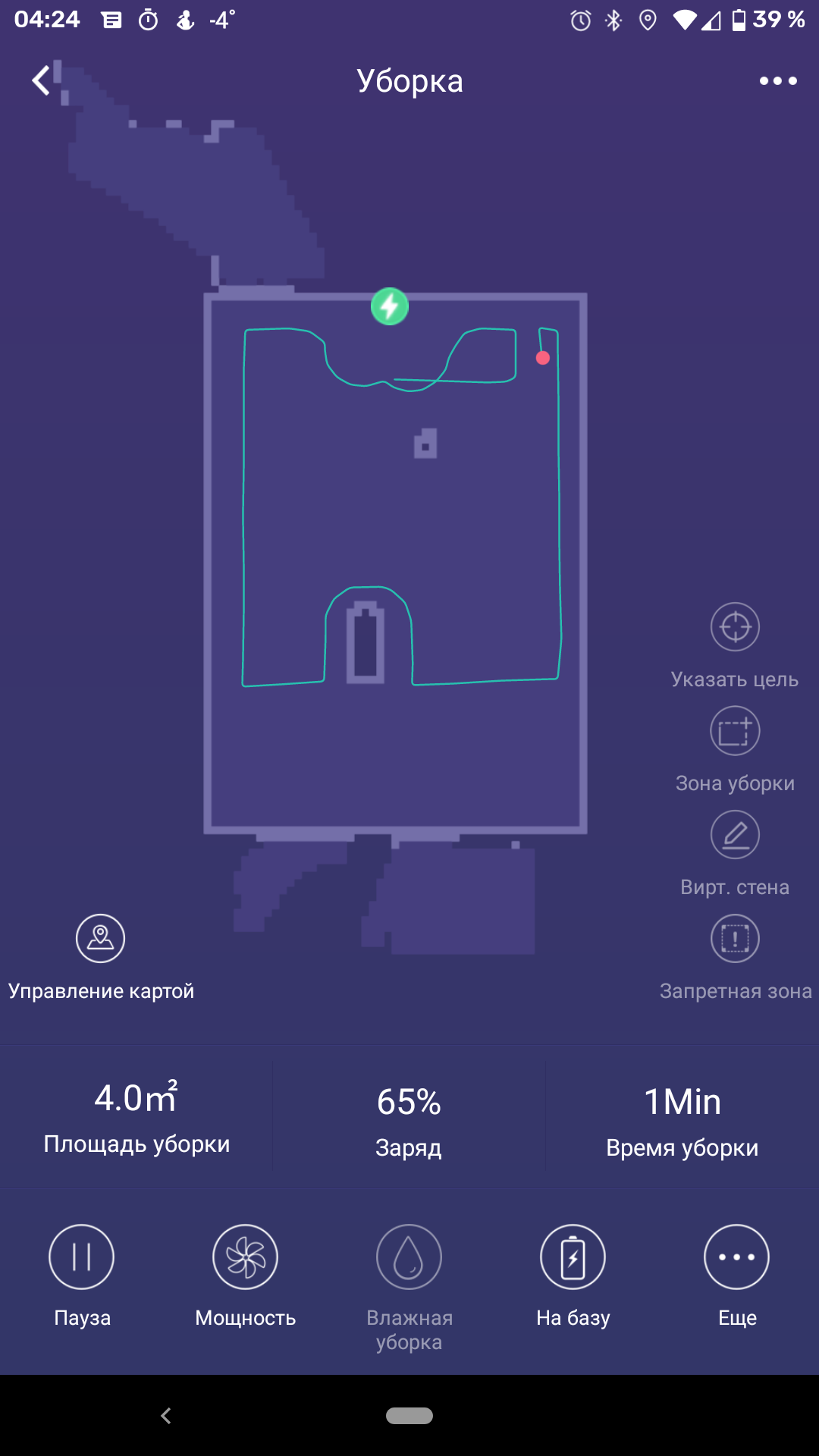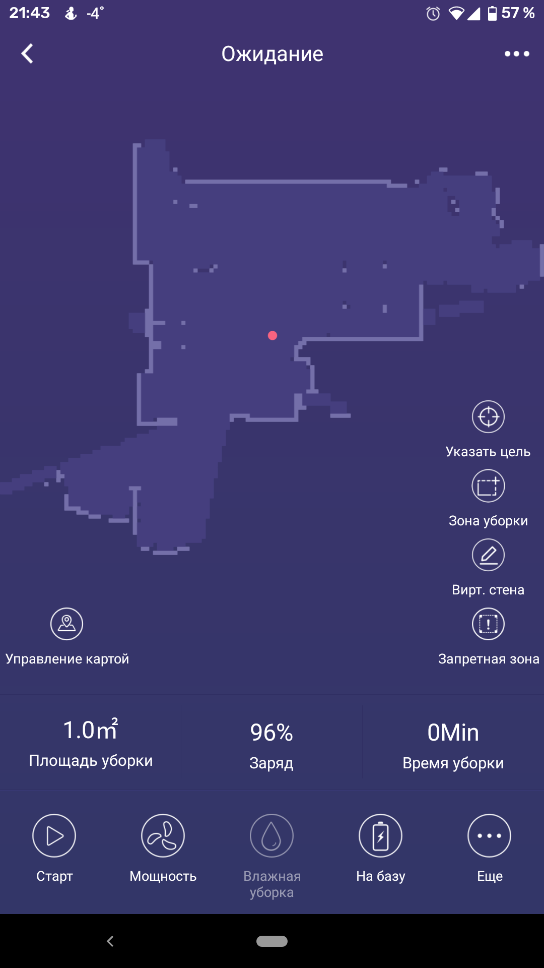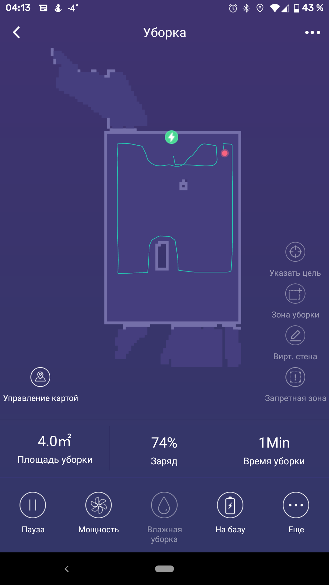 Интерфейс главного экрана очень напоминает аналогичное приложение пылесоса 360 S7, который мы рассматривали не так давно: те же самые кнопки управления режимами работы робота, расположенные внизу; такие же индикаторы площади уборки, состояния аккумулятора и продолжительности работы. Инструменты редактирования карты, которые позволяют установить зоны уборки, запретные зоны, виртуальные стены и точки локальной уборки, размещены в правой части экрана.