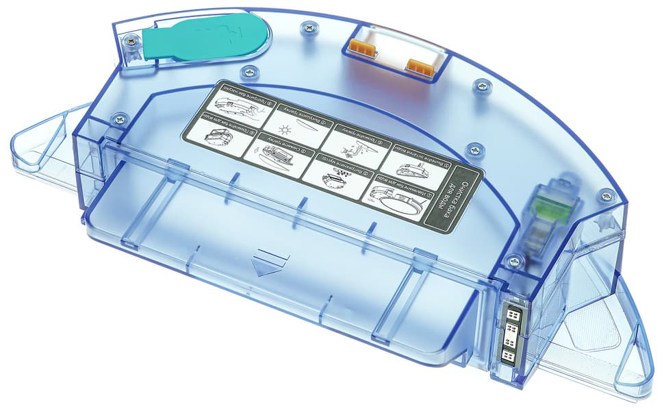 Модуль влажной уборки выполнен из прозрачного голубого пластика. На боковой поверхности нанесены метки уровня воды.