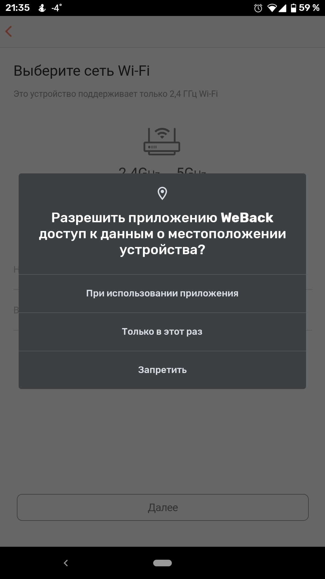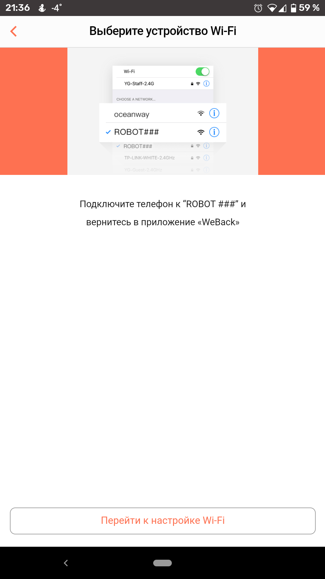Перед верификацией сети приложение требует также доступа к данным о местоположении. Рекомендуем согласиться. После этого телефон необходимо вручную подключить к созданной пылесосом временной Wi-Fi-сети с SSID ROBOT### и подождать около минуты для завершения соединения.