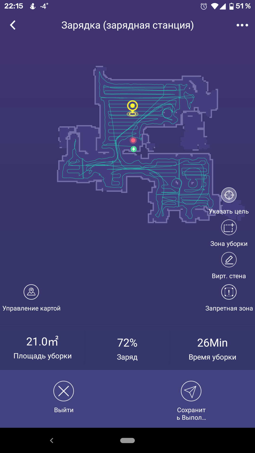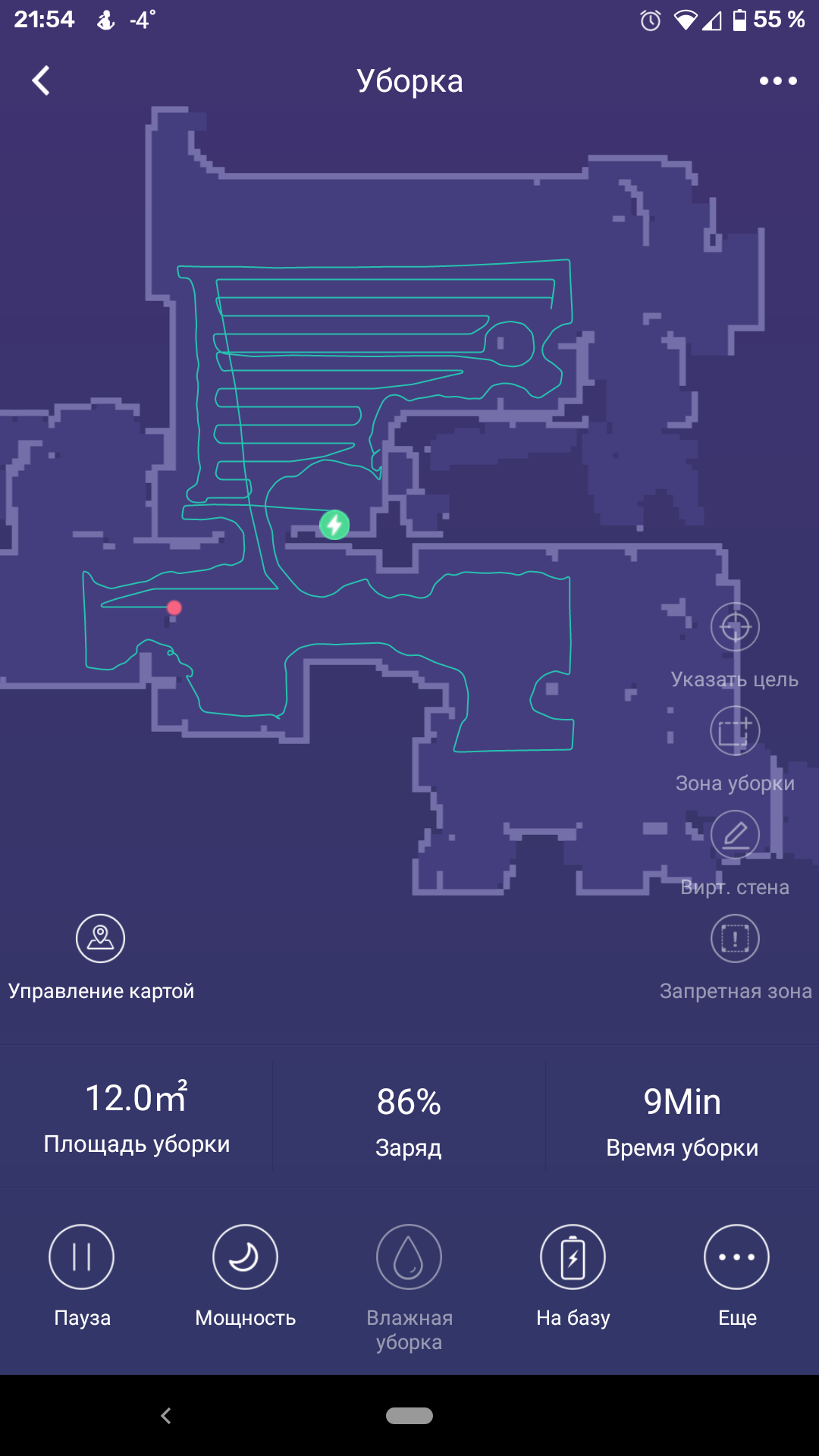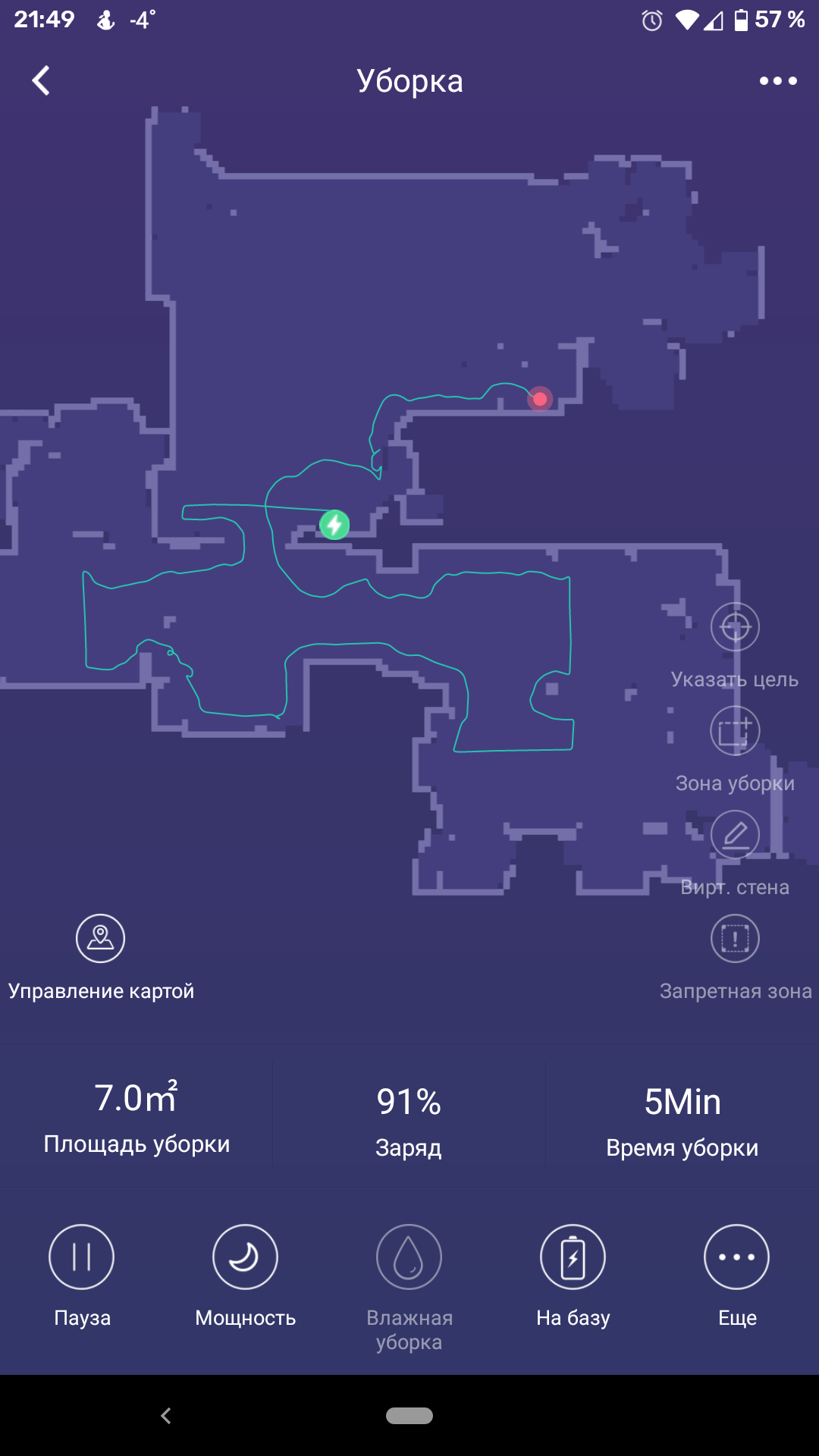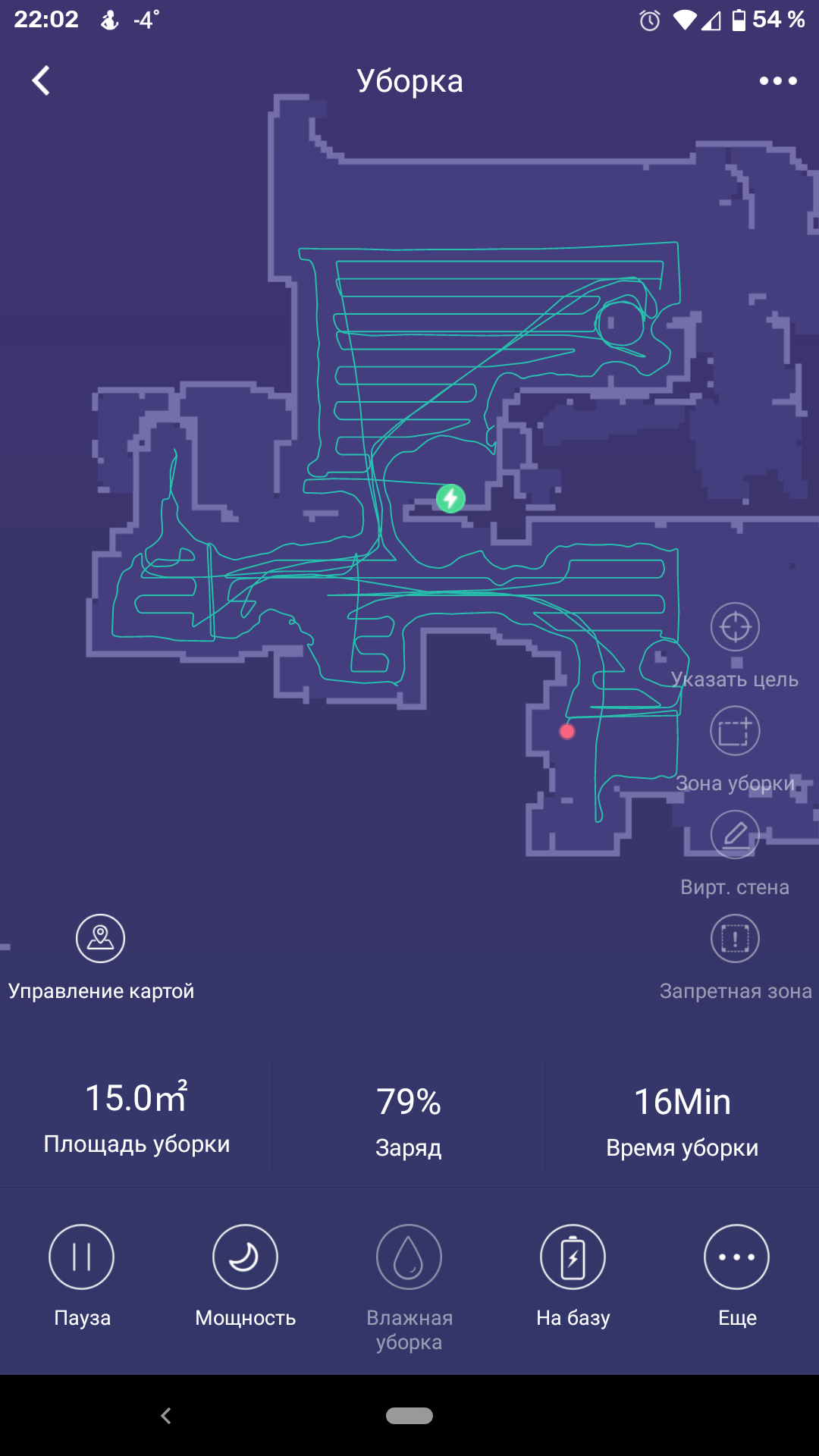 Положение пылесоса отмечается на карте приложения с заметной, около полуминуты, задержкой: вероятно, данные поступают на мобильник не напрямую, а через облачный сервис.