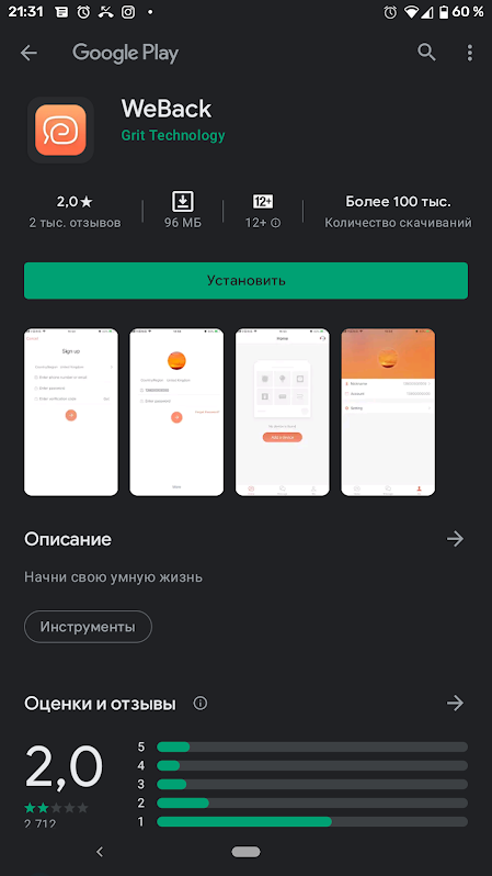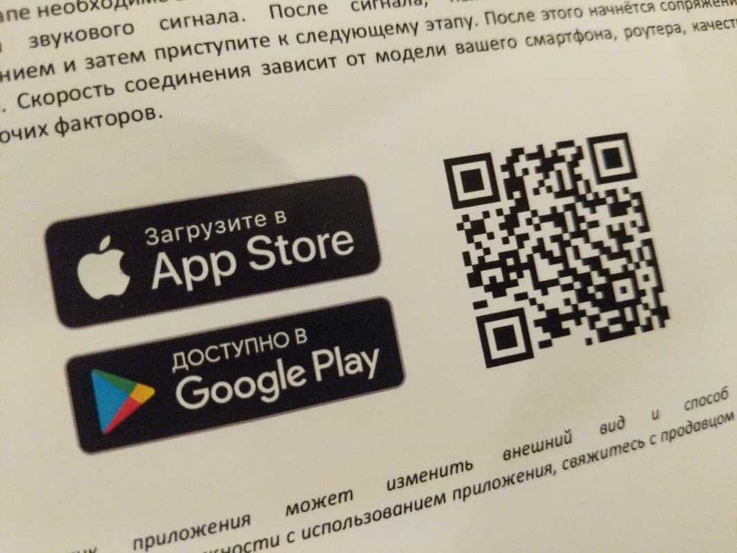 В инструкцию по эксплуатации вложен отдельный листок с кратким руководством по установке мобильного приложения. QR-код ведет на страницу WeBack, разработанного Grit Technology (более 100 тысяч скачиваний, средняя оценка — 2,0).