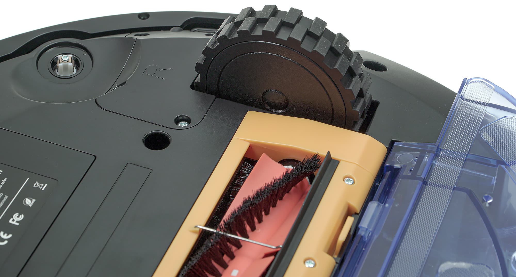 Ходовая часть пылесоса традиционная: два ведущих колеса с выраженными «грунтозацепами», которые не дают буксовать на гладком полу и улучшают проходимость на мягких покрытиях. Протектор направляющего колеса — гладкий, а само оно находится в пластиковой сфере, обеспечивающей вращение на 360°.