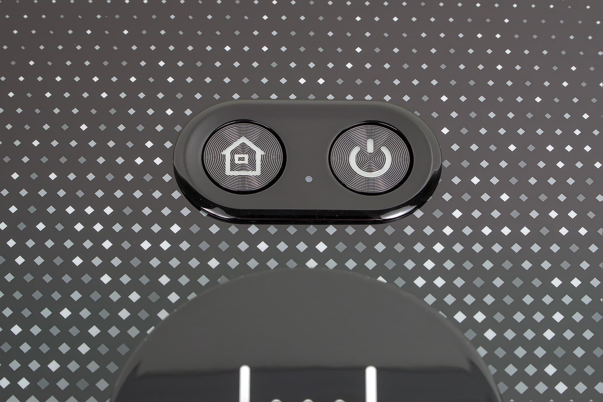 Для ручного управления на верхней панели пылесоса есть две кнопки. Одна из них запускает уборку в автоматическом режиме, вторая включает возвращение на базу. Светодиод между ними является индикатором сетевой активности.