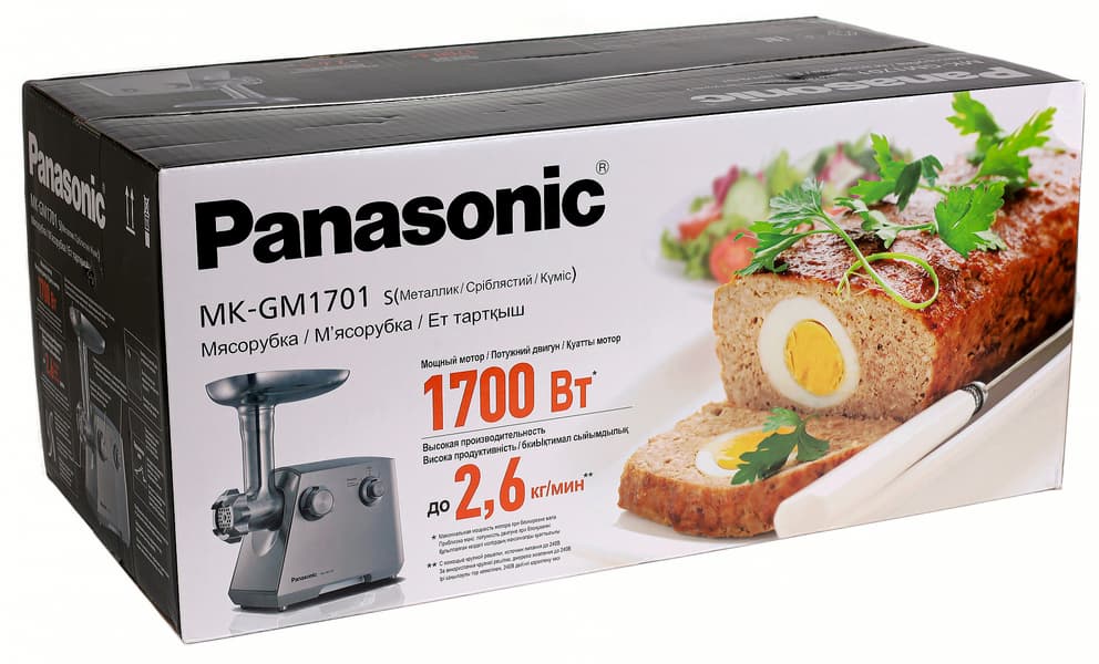 Мясорубка Panasonic MK-GM1701 относится к новинкам и была выпущена в продажу лишь в конце января 2019 года. Основная ее «фишка» заключается в ножах необычной формы. По заявлению производителя, ножи изготовлены на родине всемирно известных мечей, в японском городе Секи. Panasonic утверждает, что в ходе многочисленных испытаний им удалось создать оптимальную форму ножа. Лезвия вкупе с высокопроизводительным мотором должны творить чудеса. Так, например, производитель обещает, что мясорубка измельчит в минуту до 2,6 кг мяса.