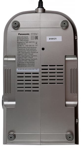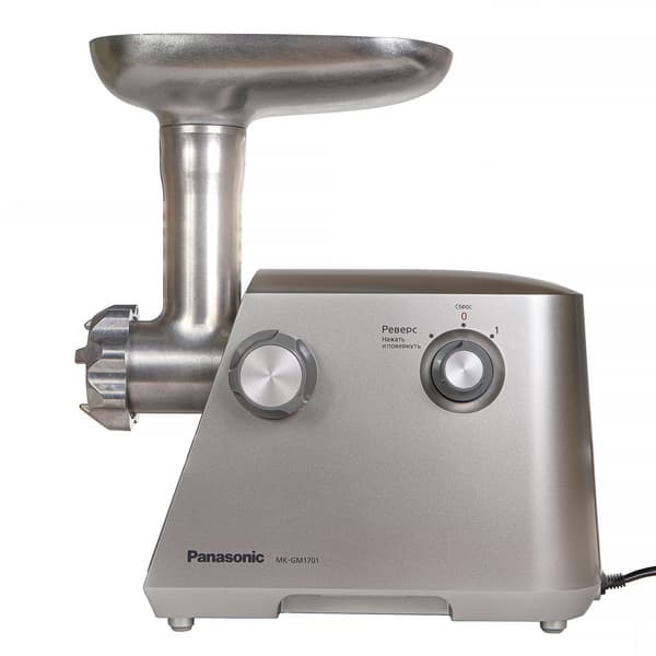 Мясорубка Panasonic MK-GM1701 выглядит очень прилично и аккуратно. Пластиковый корпус, на первый взгляд, производит впечатление металлического — таковы качество покраски пластика и удачный, полностью идентичный металлику, цвет. Форма стандартна — трапеция основанием вниз, что придает устойчивость и надежность всей конструкции. Насадка крепится с торца левой стороны. На передней стороне моторного блока находится фиксирующий винт и переключатель режимов.