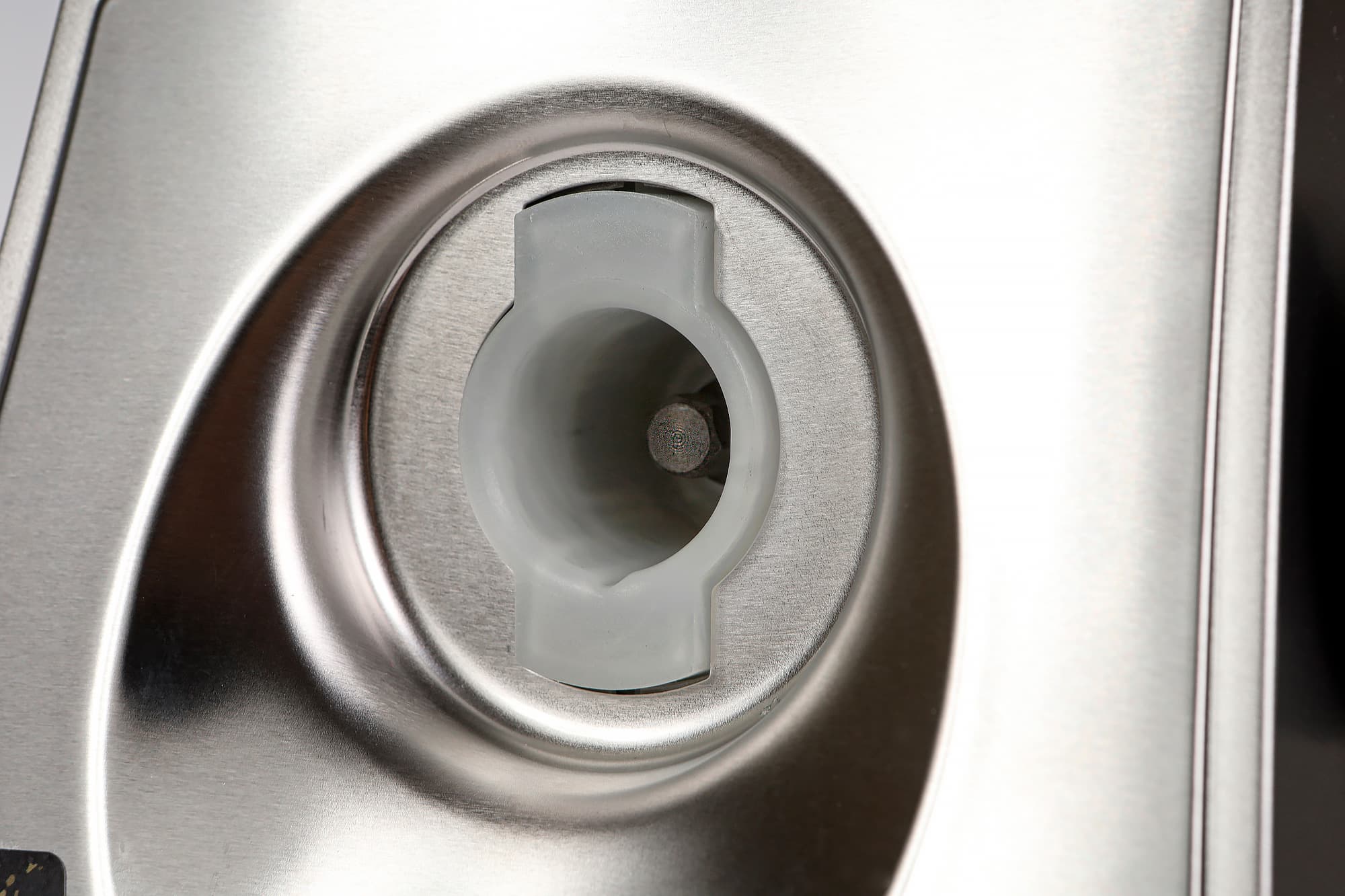 За исключением ножей, все отдельные детали блока мясорубки имеют типовую форму и конструкцию. Нож и решетки — стальные; корпус, шнек и фиксирующее кольцо сделаны из силумина. Делали отлично обработаны, поверхность гладкая, ни зазубрин, ни царапин на них нет. Обращает на себя внимание только высота загрузочной горловины. Насколько удобно будет мыть корпус мясорубки, покажет только эксплуатация.