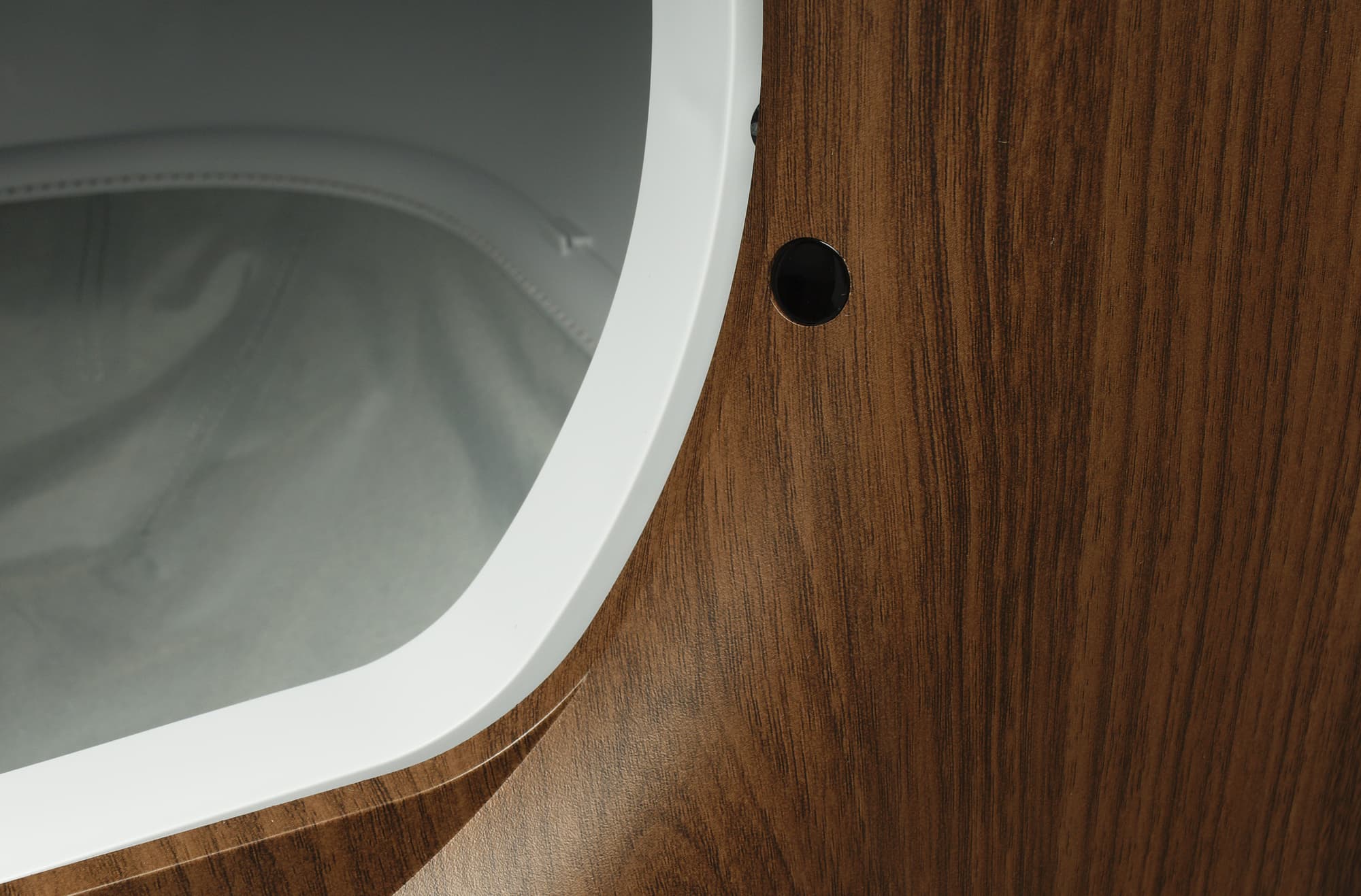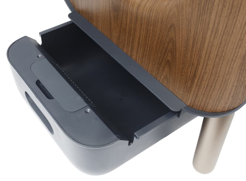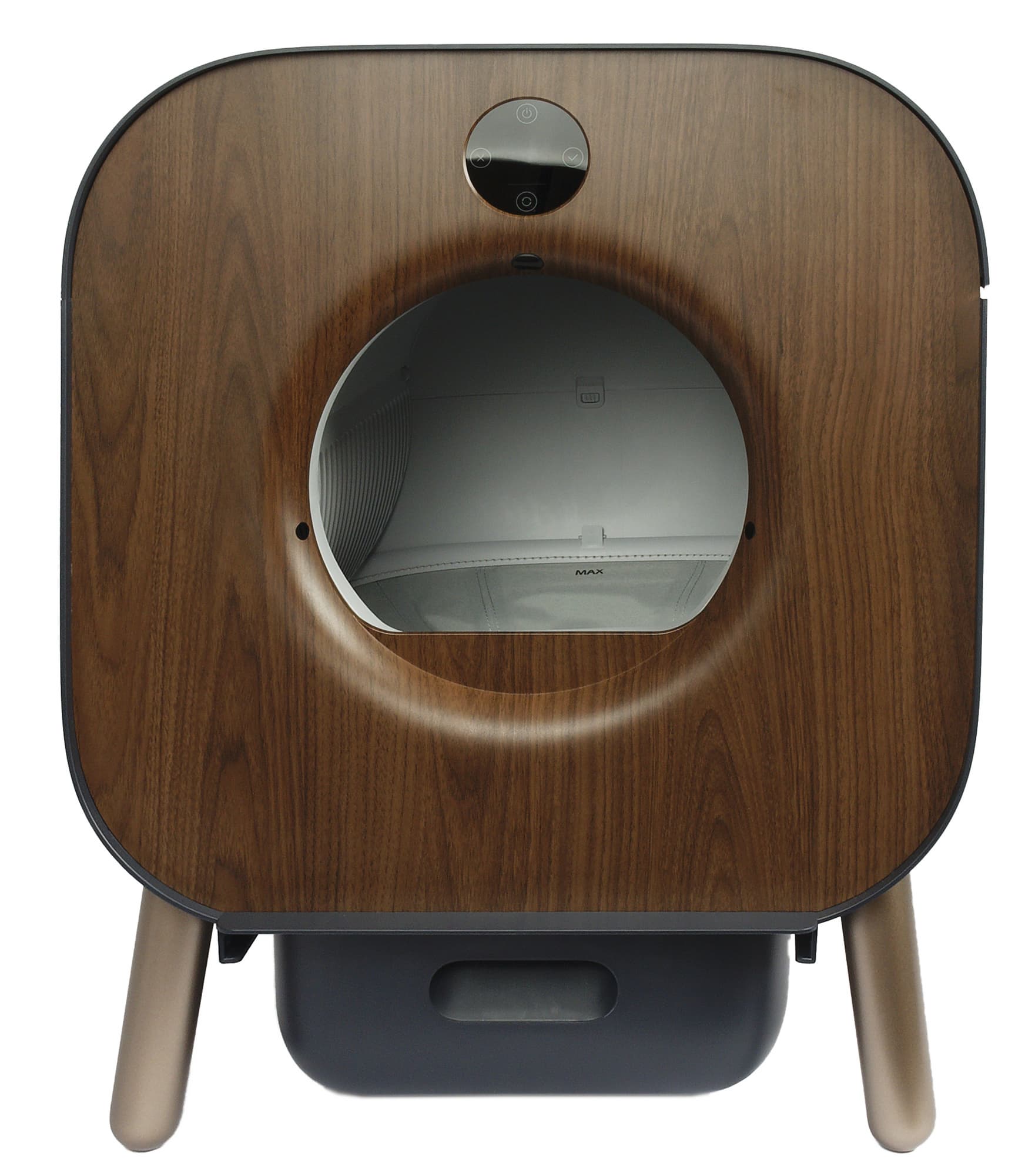 Визуально самоочищающийся лоток выглядит, без преувеличения, шикарно. Корпус устройства сделан из черного матового пластика, передняя панель оформлена под дерево, массивные ножки окрашены в бронзовый цвет. Пожалуй, не будет преувеличение сказать, что такое устройство уверенно впишется в любой интерьер (в том числе и в квартиры, отремонтированные по высшему разряду). Исключением могут стать разве что дизайнерские решения, в принципе не подразумевающие деревянных текстур в помещении.