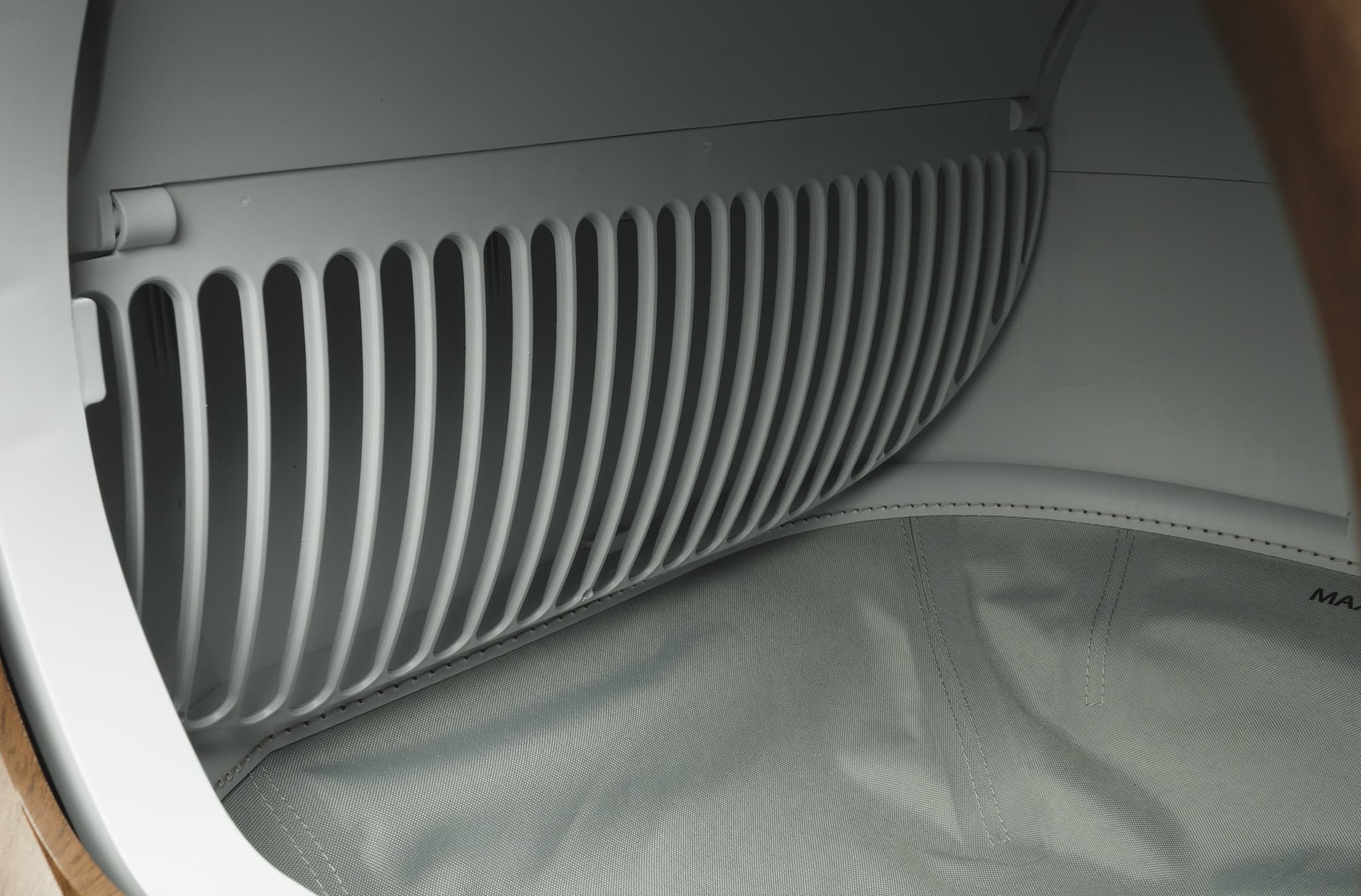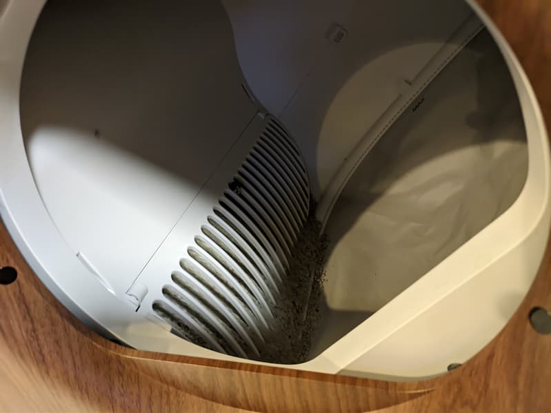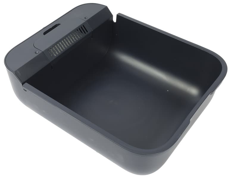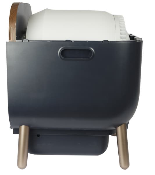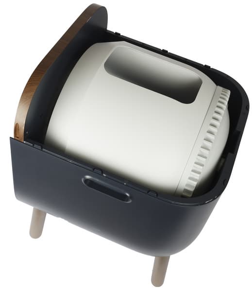 Под крышкой расположен отсек для кошачьего наполнителя, выполненный из серого пластика. Именно в нем будет происходить самое интересное. После того, как кошка сделает свое дело, отсек начнет вращаться, а наполнитель будет профильтрован через специальные прорези. В результате отработанный наполнитель попадет в лоток для мусора, а сухой — останется внутри отсека.