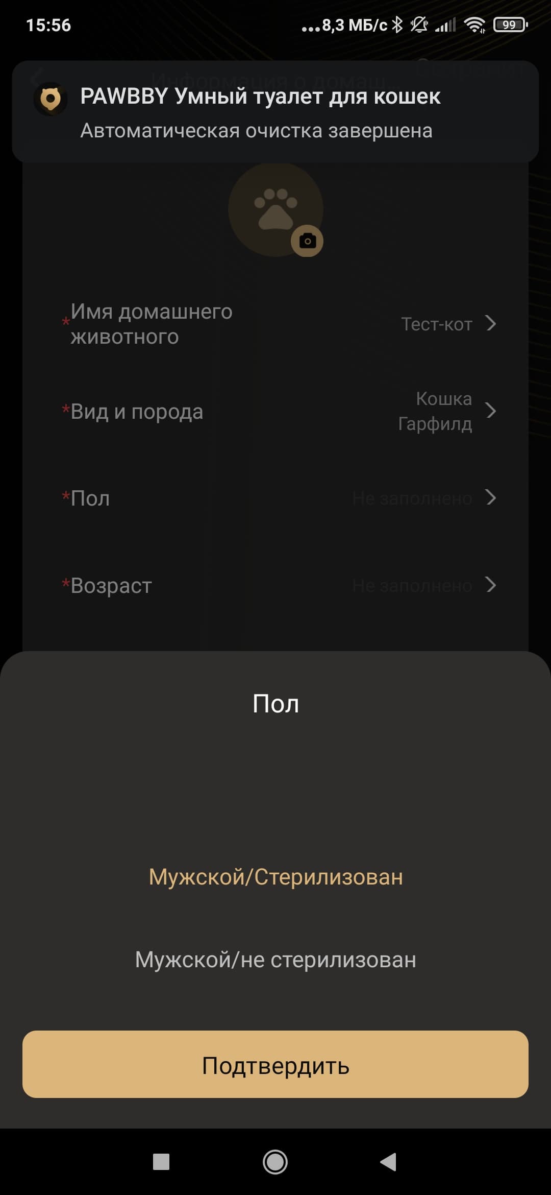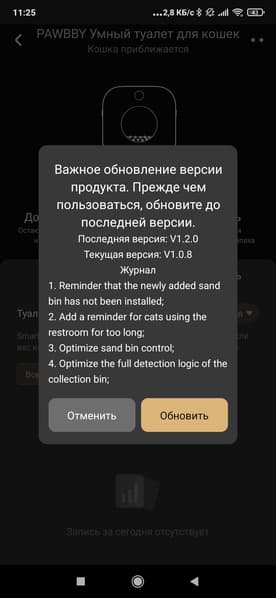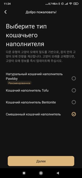 После первоначальной настройки нам предстоит выбрать тип используемого кошачьего наполнителя (на что это влияет — не очень понятно) и обновить прошивку устройства.