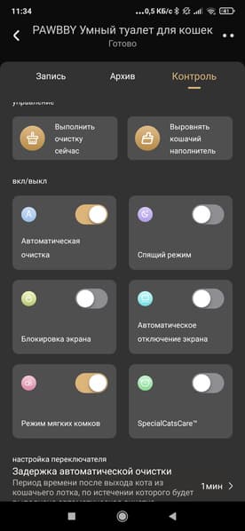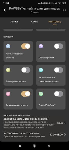 Внимание привлекают «режим мягких комков» (устройство сделает 2-4 колебательных движения для закапывания мягких комков) и «SpecialCatsCare» — специальный режим для котят и больных животных (автоочистка будет отключена).