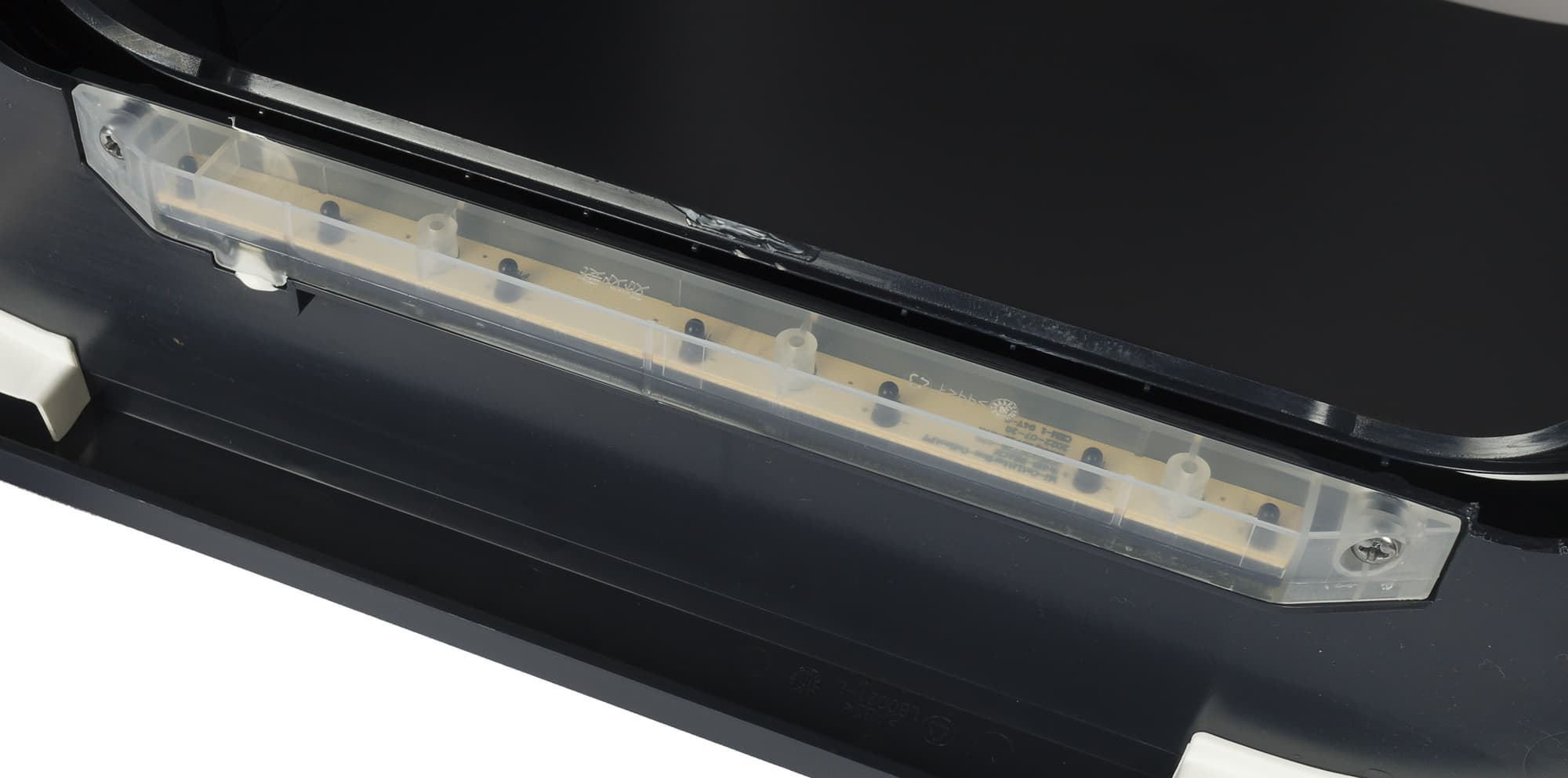 Вид снизу: тут мы наблюдаем два пластиковых элемента. Это инфракрасные датчики, определяющие правильность установки лотка и степень его заполненности.